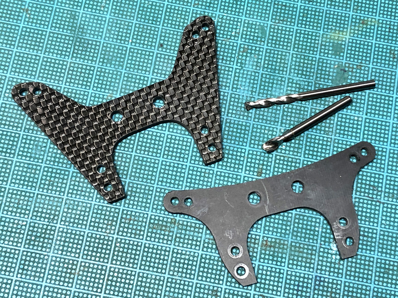 寸法が決まったら3mm厚のカーボンプレートから切り出して各穴を開けます。