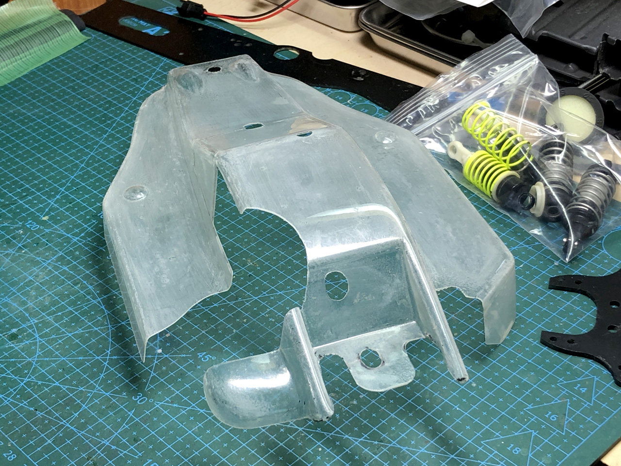 コレで本当にオフロードなんか走れるのかは疑問ですが、とりあえず完成に向けて作業を進めます。ちなみにこの中古ボディーが白いのは、旧塗膜の剥離で荒れた内側を再塗装に備えてサンディングしてあるからです。