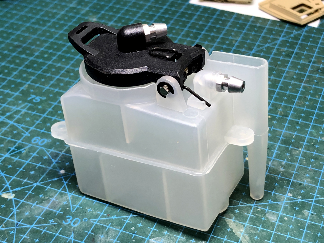 センターシャフトからフロントデフに伸びるドライブベルトの側面と同じ位置でカットしたアッパーデッキに寄せてタンクを仮置きしてみます。