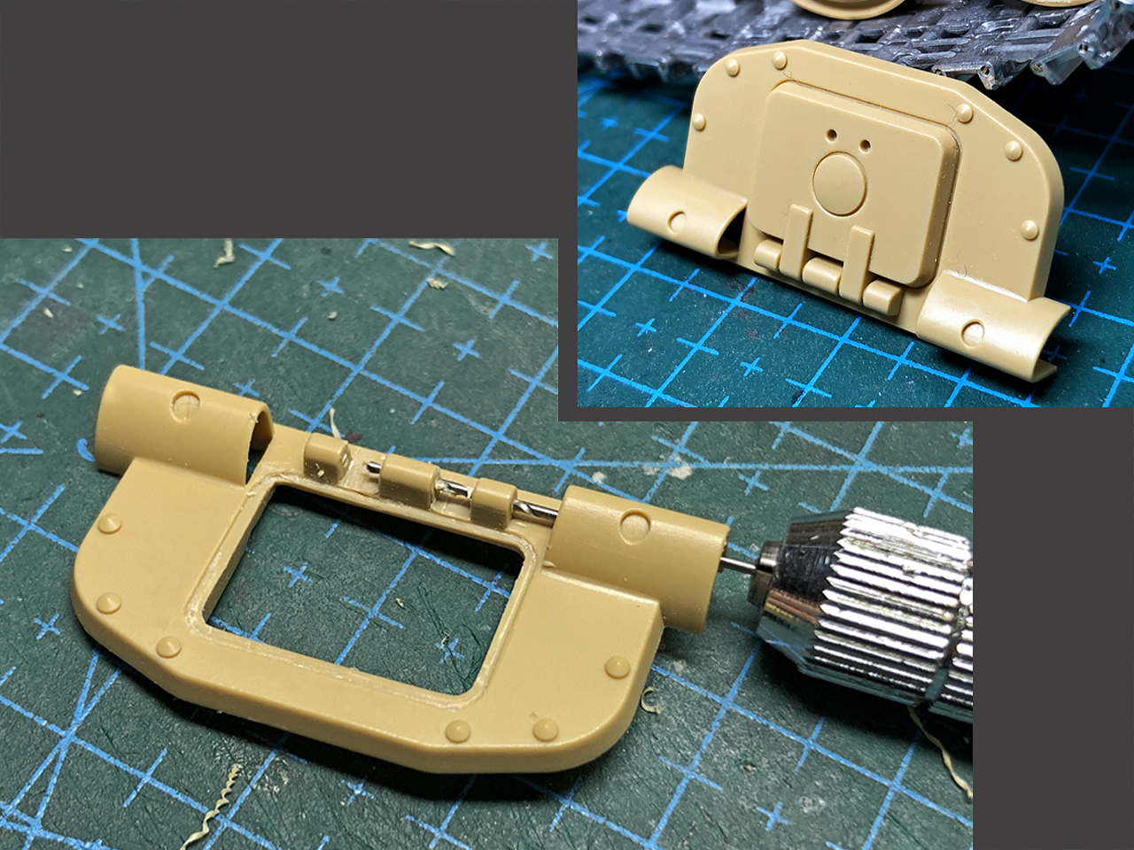 プラバンの組み合わせでハッチを作りヒンジ部分に真鍮線を通して開閉式にします。<br>砲塔の下部パーツ後端にはナットを埋め込んだプラバンのブロックを接着しておきます。