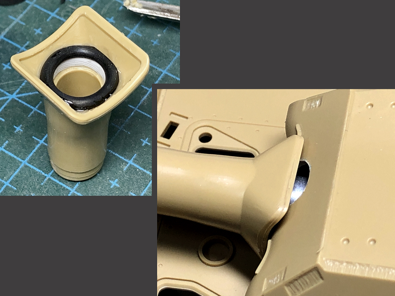 防盾 パーツ裏側を整形して内径8mmのОリングを接着します。<br>この部分を砲身基部のリコイルしない外側のパイプに押し込んで固定します。