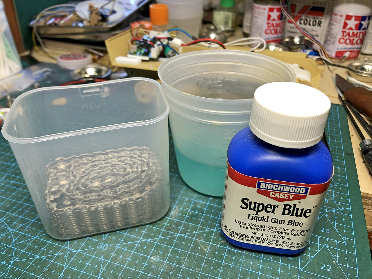 履帯を10分ほど液に浸けたところで、それ以上の変化が見られないので引き上げます。