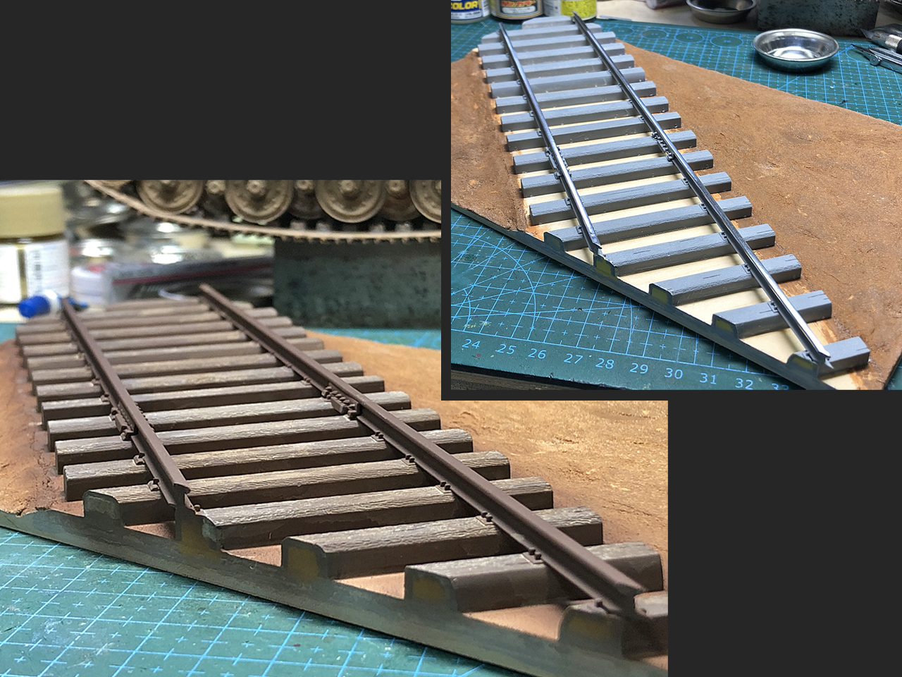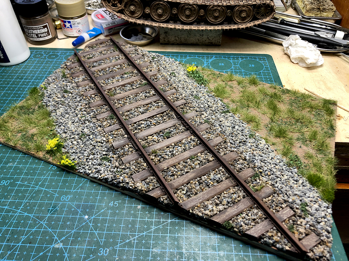 バラストが固まったら、レールや枕木にウェザリングを足しておきます。