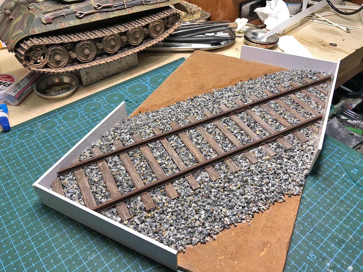 枕木部分にウェザリングのベースになる「バフ」や「フラットアース」でウォッシングしてからバラストを敷き詰めます。