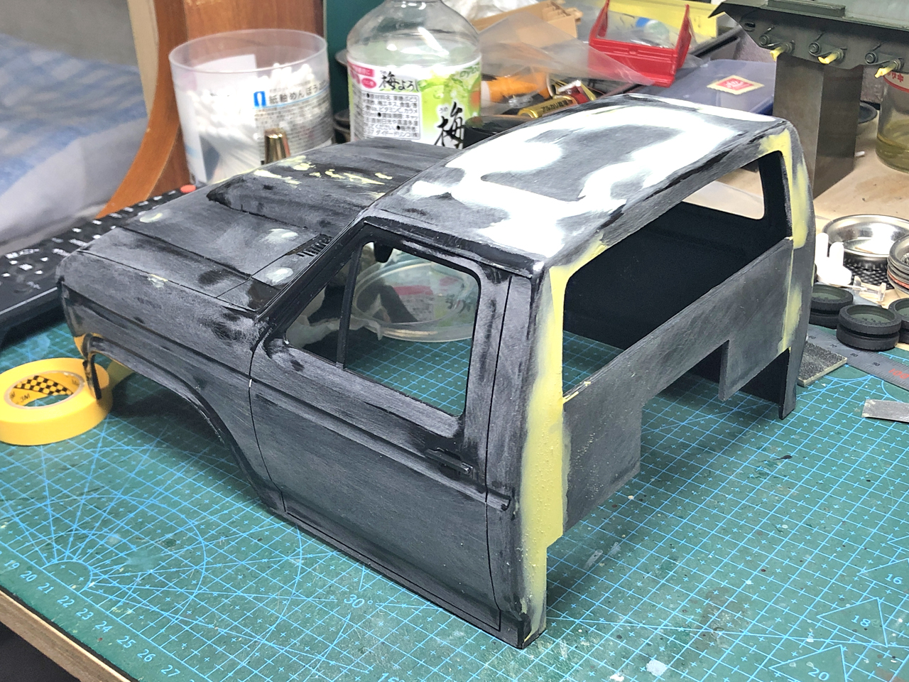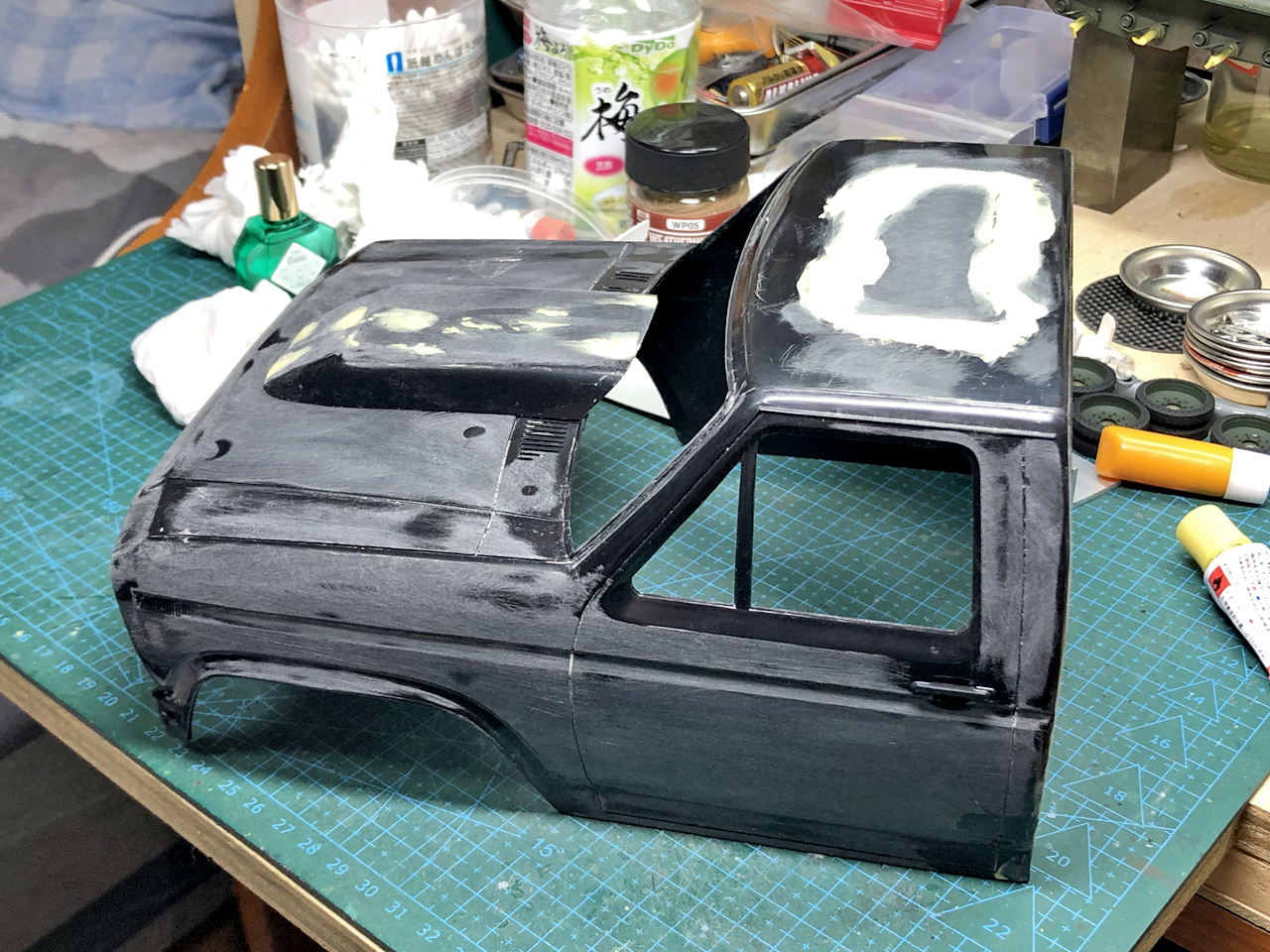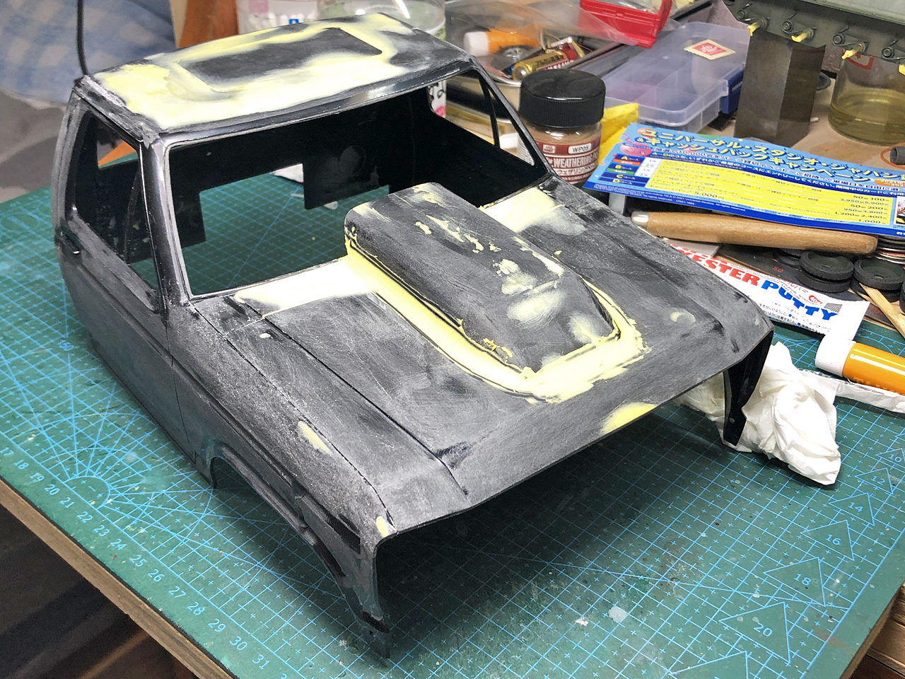 ルーフに開いたサンルーフ用の開口もルーフパーツを接着してからパテ埋めしてしまいます。