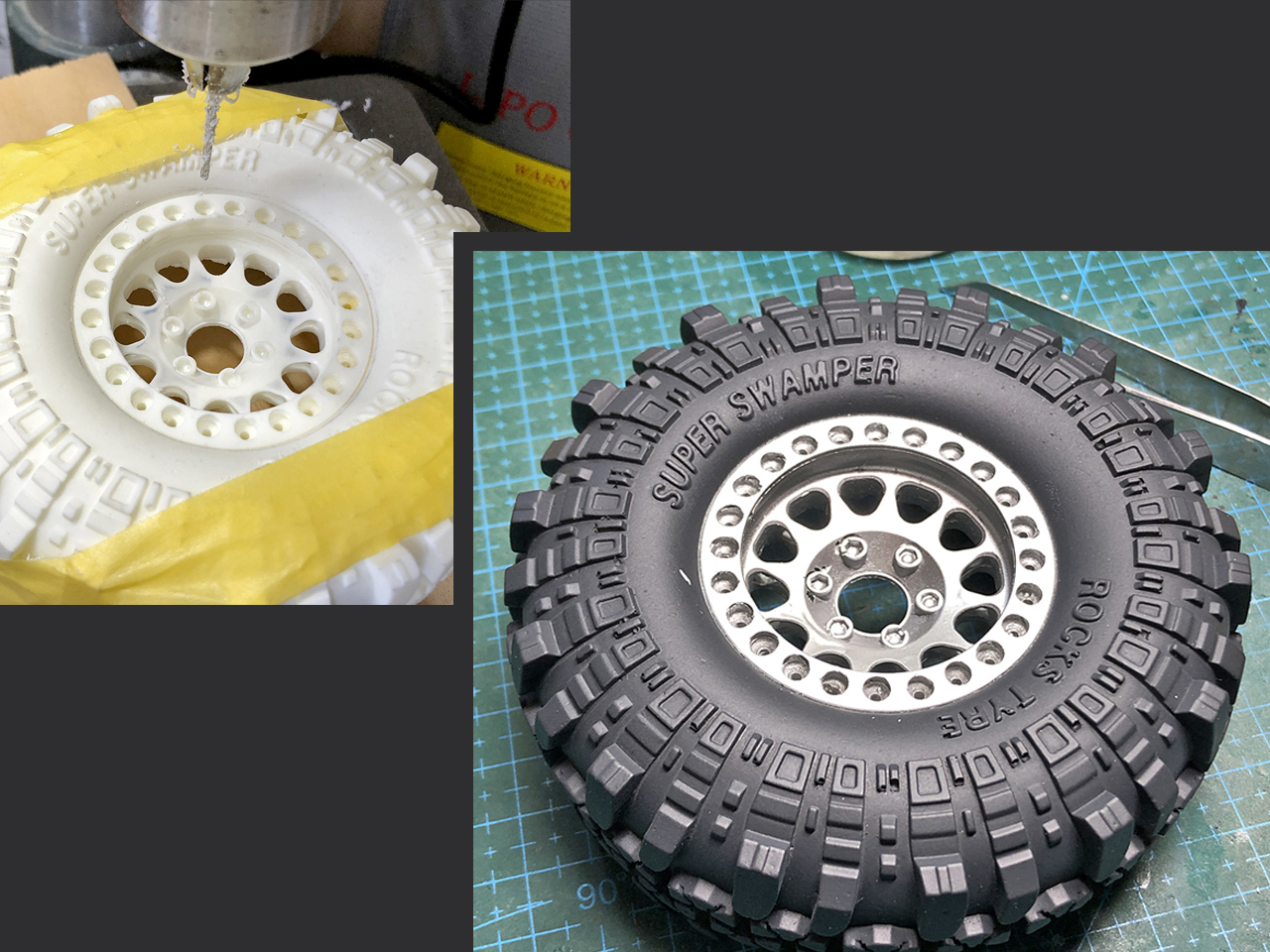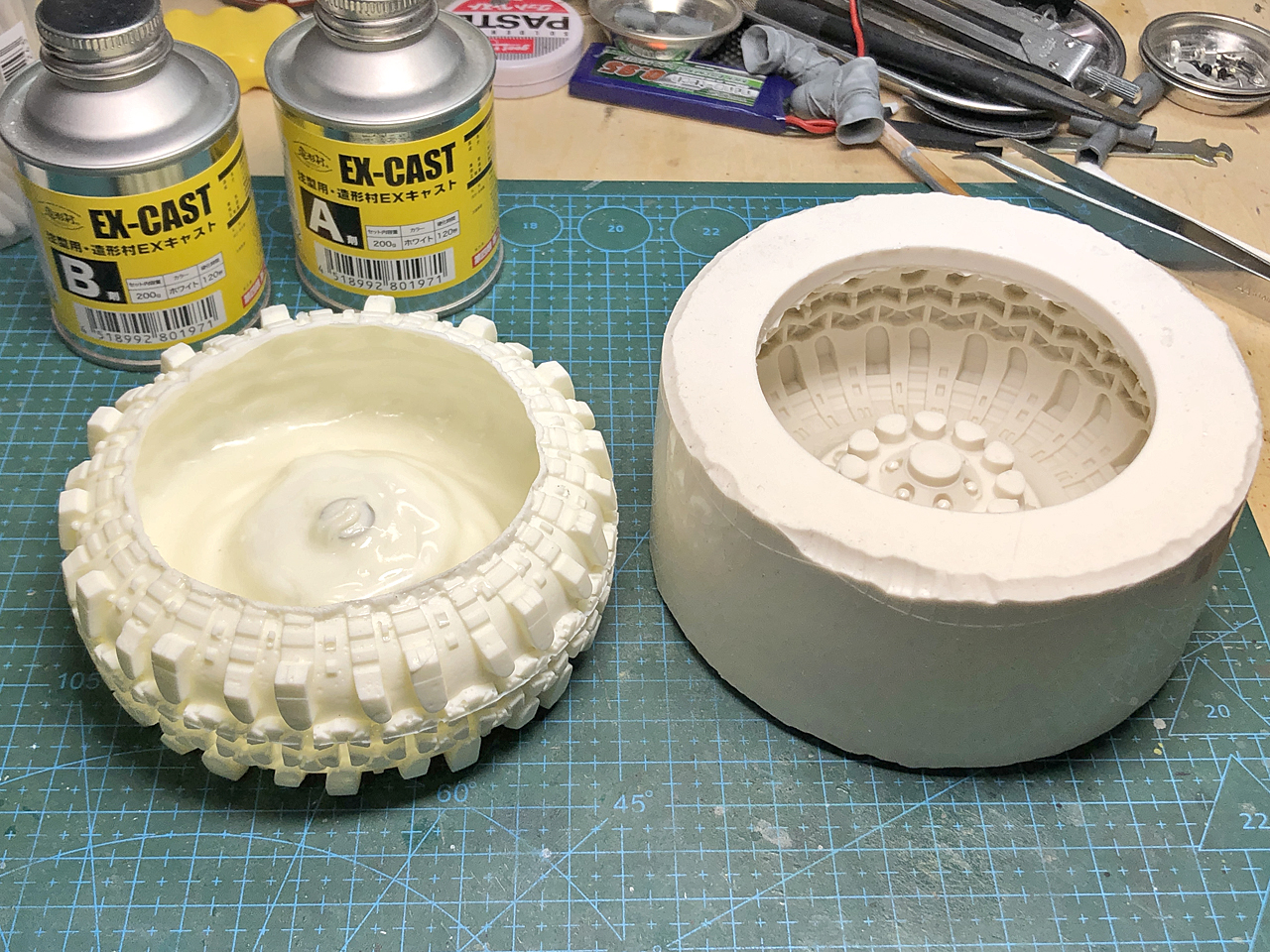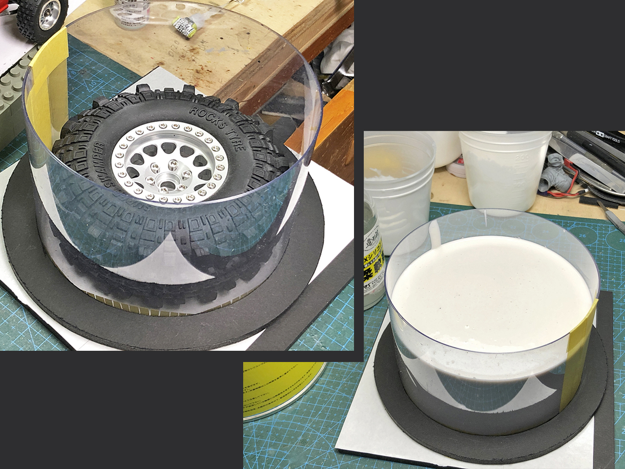 組み付けたタイヤとホイールに塩ビ板で囲いを立てて、シリコンゴムを流します。