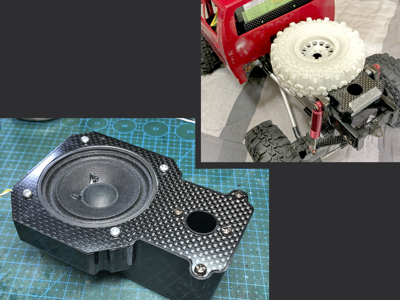 このスペアタイヤをなぜ肉薄に成型したかというと、スピーカーボックスにスッポリ被せてこれを隠してしまいたかったからです。