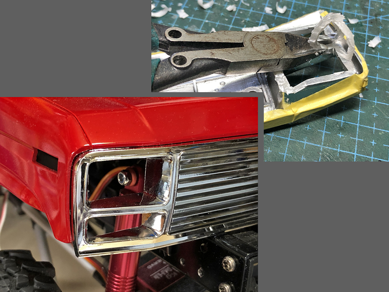 今回はマルチファンクションユニットでフル電飾なのでこのグリルパーツに一体成型されたライトレンズのモールドを切り取って開口し、ライト点灯の為の下準備をしておきます。
