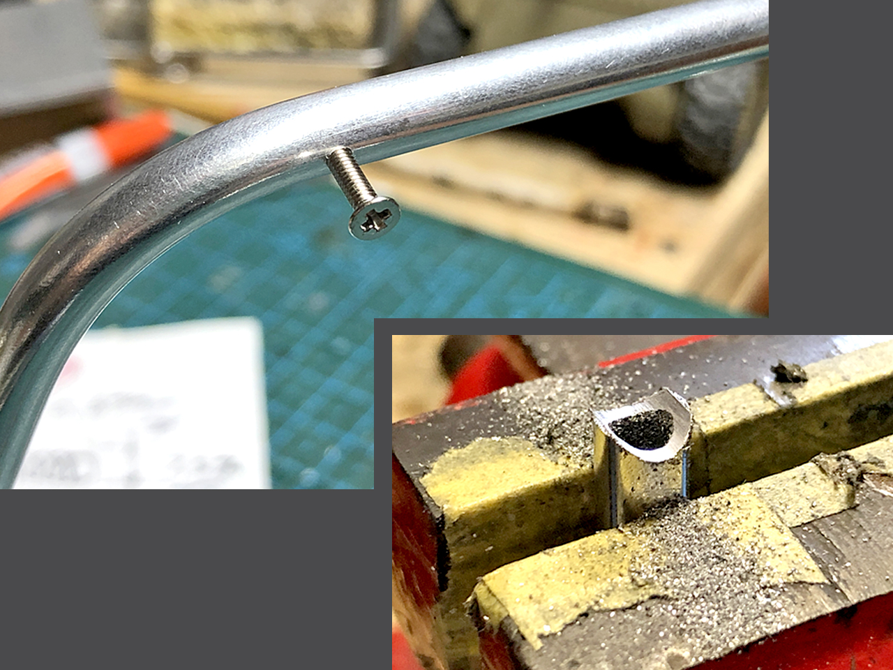 そこでまず接合する側のパイプ先端をヤスリで丸く削り、もう一方には穴を開けてタップを立ててビスをねじ込みます。