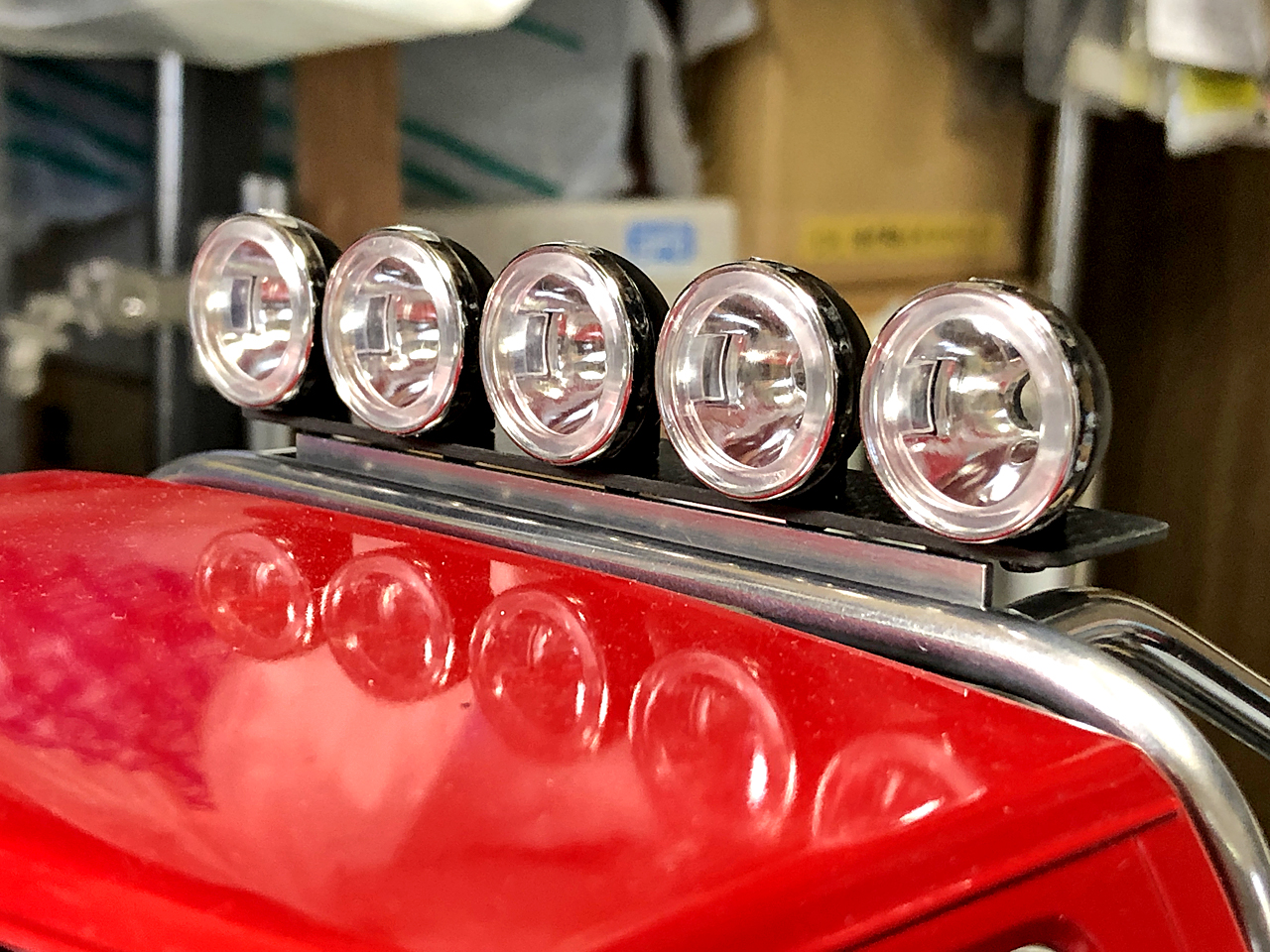 このライトセットをルーフの先端に取り付ける為のカッコイイ樹脂製台座パーツが付属していましたが、ワタシはロールバーに付いている方が好きなのでこの位置に。