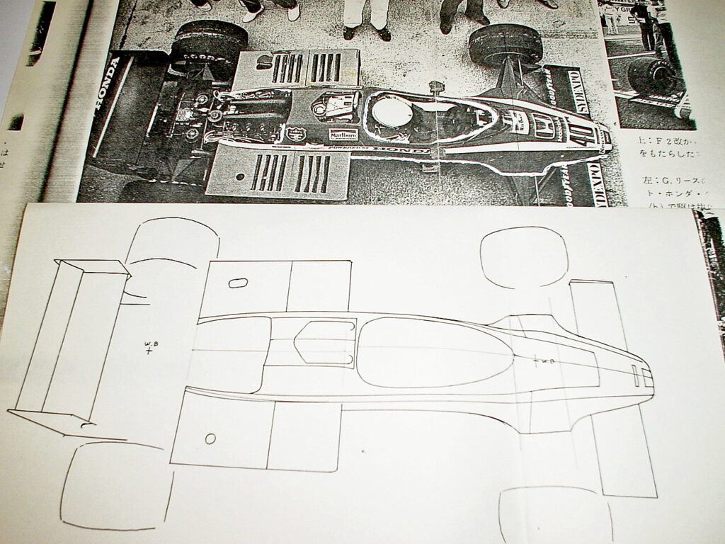 車種が決まったら、まずは資料を集めます。今はミニカーも手に入りますが製作当時は人気がなくマイナーな車だったので、特に中身の写真を見つけるのが大変です。今回は「フルスクラッチ、フルディティール」が製作のテーマなので資料集めの手は抜けません。この車、ホンダのF1復帰第一号なのでレース毎に随分と細かく仕様が違います。カッコよさと資料の量で仕様を決めましょう。