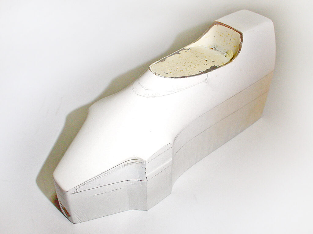 今回はカウルを取り外し式にするので薄く作ります。図面に合わせて樹脂ブロックを削って型を作り真空成型します。真空成型では使用する材料の表面が製品になる為形状や角の丸みは板厚を考えて作ります(ひとまわり小さく作ります)。モデルのサイズが小さいのでパネル分割のケガキ線は入れてません。成型後に位置決めをしてカットします。一応、サフェーサーを吹いて表面を仕上げます。