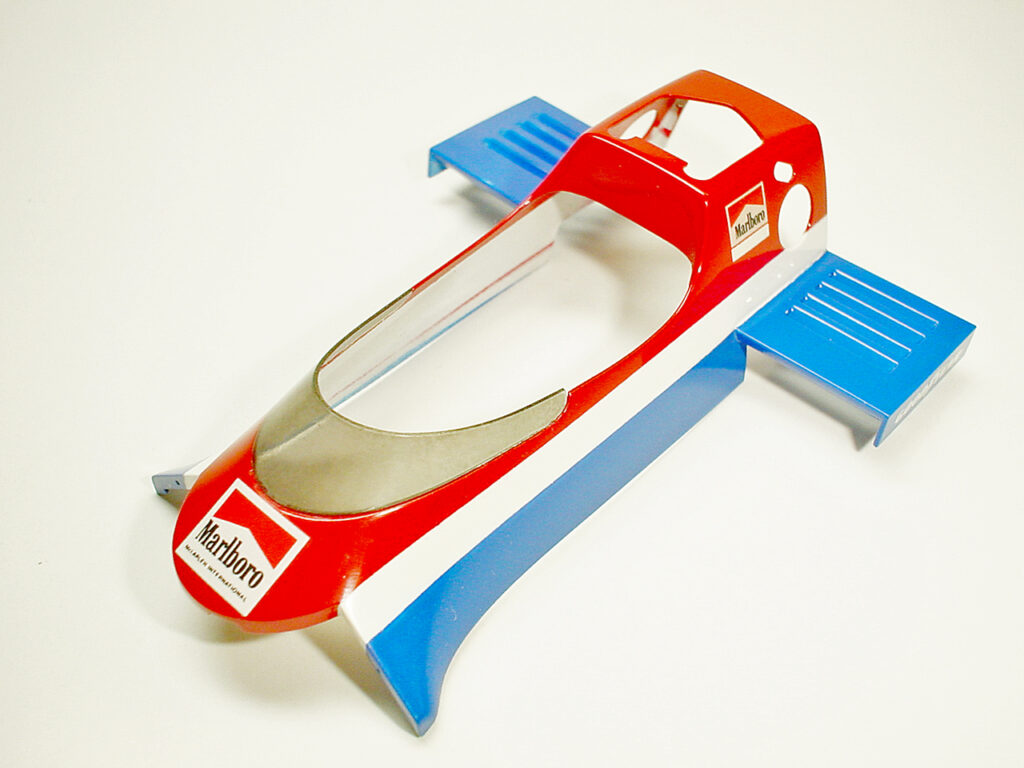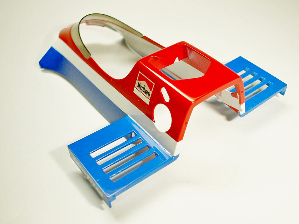 真空成型したアッパーカウルのパーツをトリミングして各部のフランジやサイドポンツーン上面を追加。サイドポンツーン上面はプラバン箱組みでエアアウトレットのフィンも再現してます。スクリーンは一旦切り離してスモーク塗装後に接着してます。当時完成までに時間が無く、カウルの裏面は塗ってません。被せりゃ(ほとんど)見えないし。