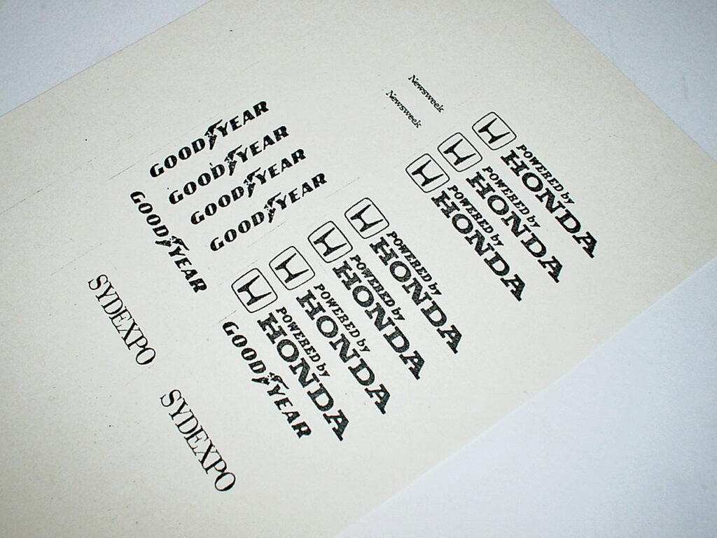 無いものは作ります! まず、写真からスポンサーロゴの書体を確認し実際の10~15倍のサイズで書き起こします。パソコンを持ってなかった当時、ワタシにはこの地道な方法しかありませんでした。(むかし取得した「レタリング検定2級」の資格が役に立ってます♪)