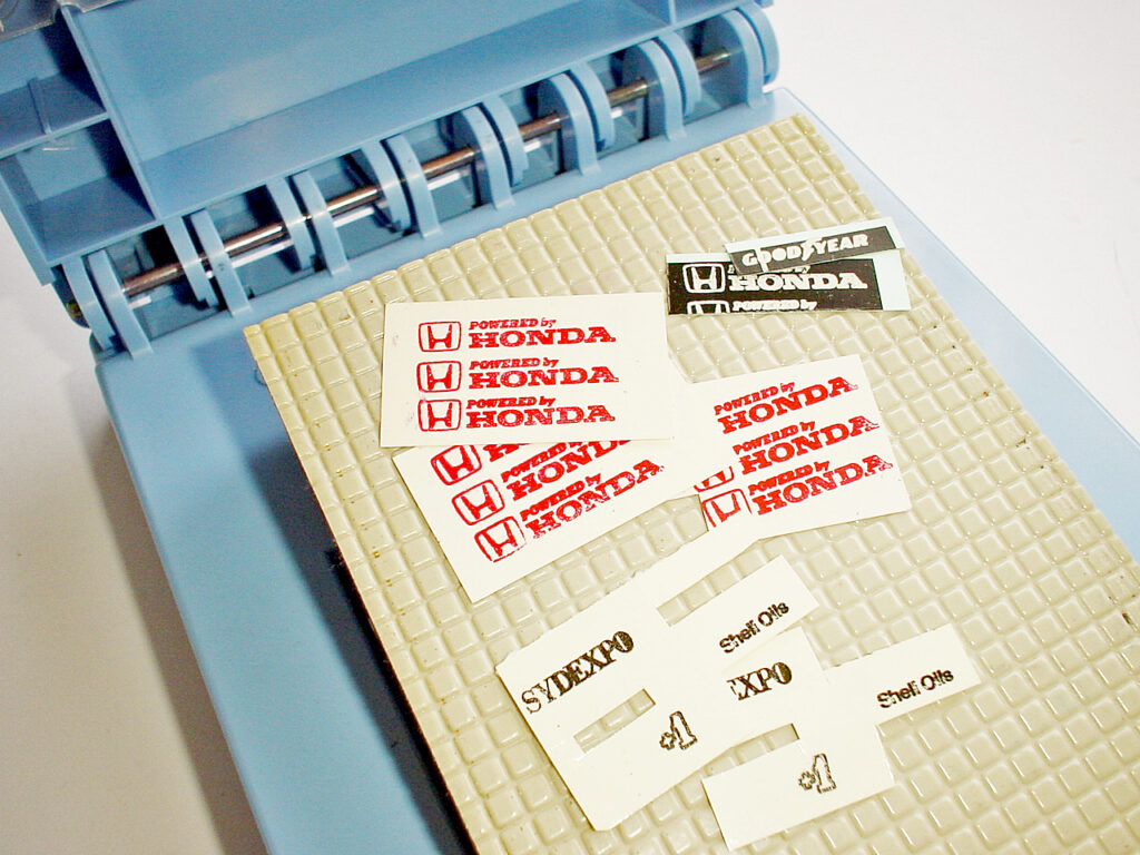 クリヤーデカールに印刷してみます。写真は何度か試した中の失敗作(笑)です。文字外形が少々にじんで鮮明度が悪いですが何とか使えそうな物を本番用に選別しておきます。この印刷機用のシルクスクリーンの「目」がそれほど細かくない(当たり前か)ので、特に極小文字の再現度がツライです。