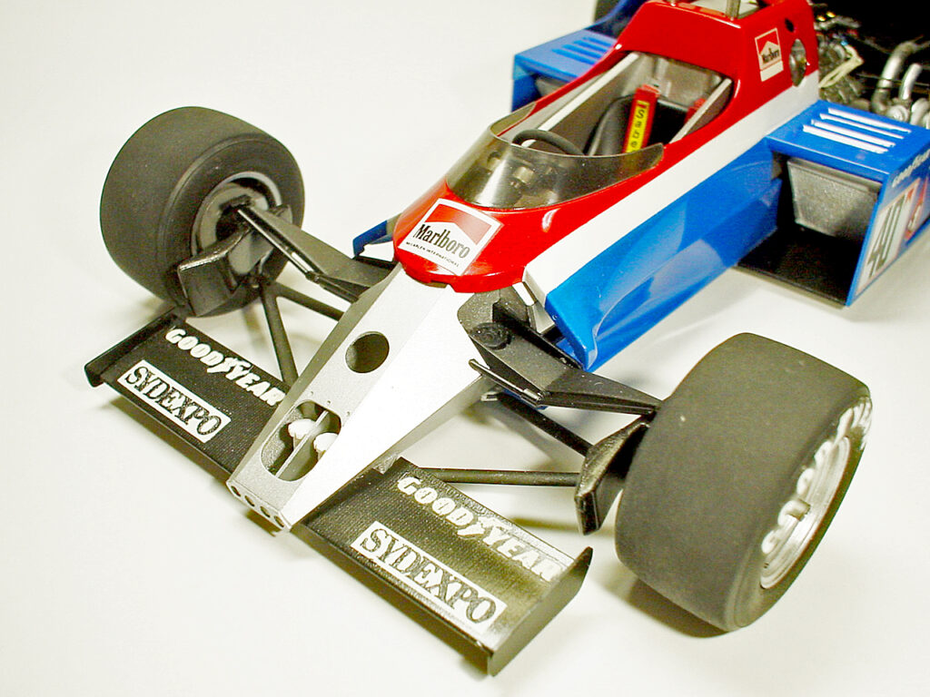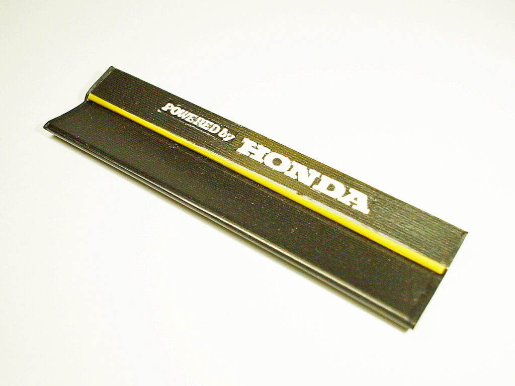 フォワードウイングも脱着式です。この2枚の羽根の間には隙間があり、バラバラにならない様に両端を0.5mmのプラバンで連結してます。サイドパネルの裏側に爪が出ていて一体化したウイング両端の溝に差し込んで固定します。「POWERED by HONDA」デカールも自作です。