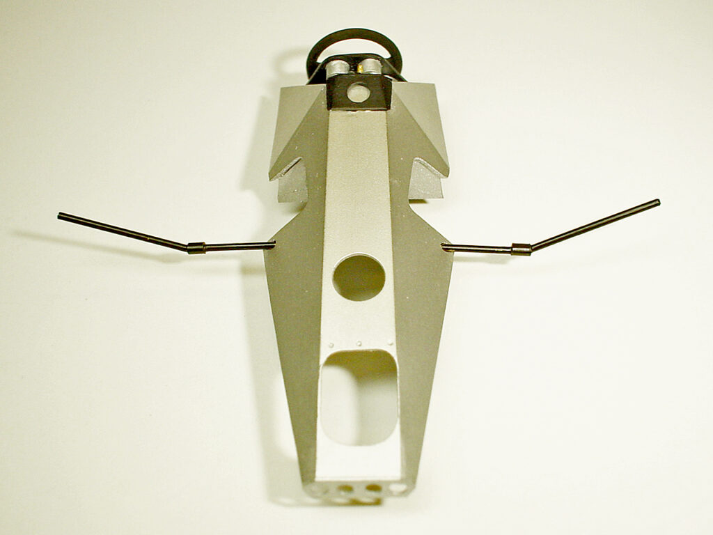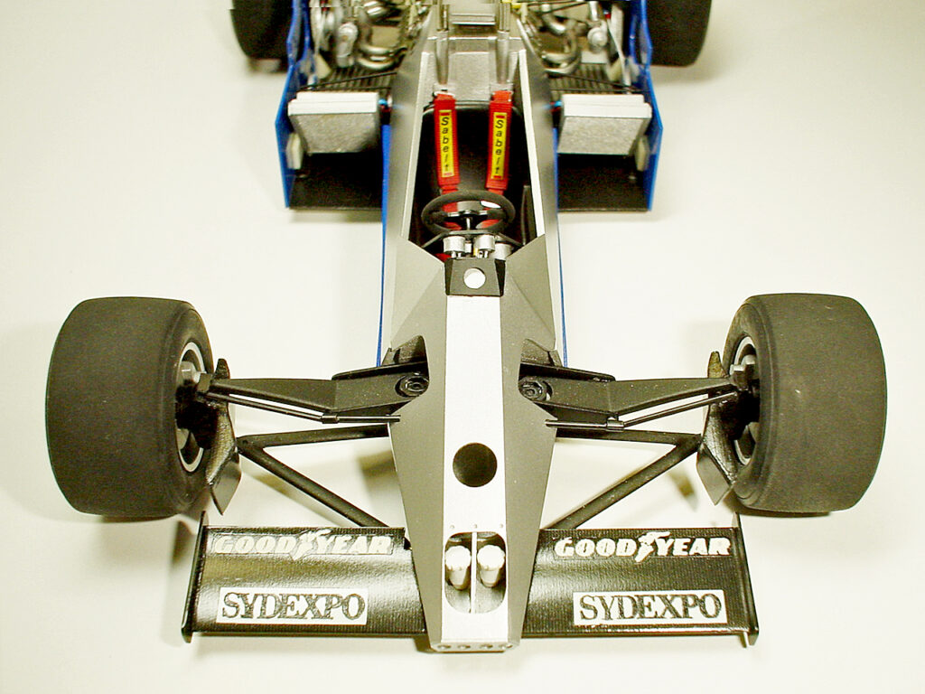 センターモノコックはプラバンの箱組みです。当時主流だったアルミ(カーボンモノコック登場はこの2年程後)の質感を出したくて、グンゼのメタルカラーを吹いたあと磨いてます。フロントサスペンションはプラバンで翼断面の棒を作って芯に真鍮線を入れてあります。キングピンは虫ピンを使ってステアを可能にしてますがタイロッドで連動させる事が難しかったので、結局固定してしまいました。