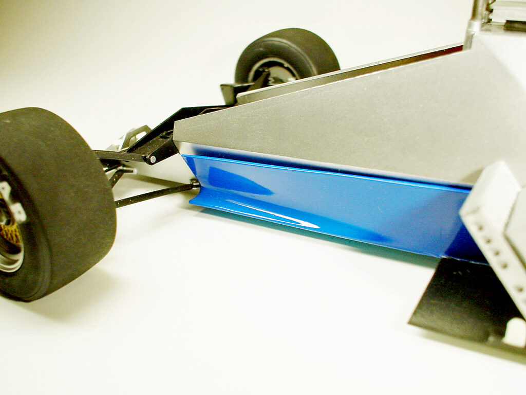 サイドポンツーンの側面パネルは0.5mmのプラバンから切り出しただけです。これも両面をサフェ→ホワイト→青→クリヤーの順で仕上げます(デカールは全て自作)。製作時(93年)は写真を撮ってなかったので、全て完成後の写真を使ってます。ただ、完成後も出来るだけ分解できるように多くのパーツを脱着構造にしてます。このパネルもシャーシの隅の爪に差し込んで位置決め・固定が出来ます。