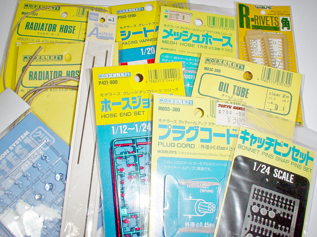 製作当時、今では想像出来ない程のF1模型ブーム真っ只中だったので模型工作用の様々なアクセサリーパーツが市場に溢れてました。あの「モデラーズ」が一番ノッていた時期でしょう。模型好きとしてはどーかと思いますが一応これを一通り揃えてエンジン周りのディティールアップに使います。因みに左上の「初期型」メッシュホースは質感最高です。これだけでも再販して欲しい!
