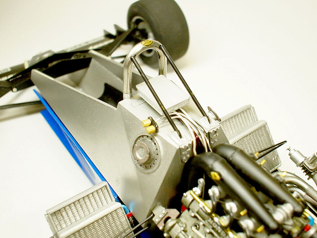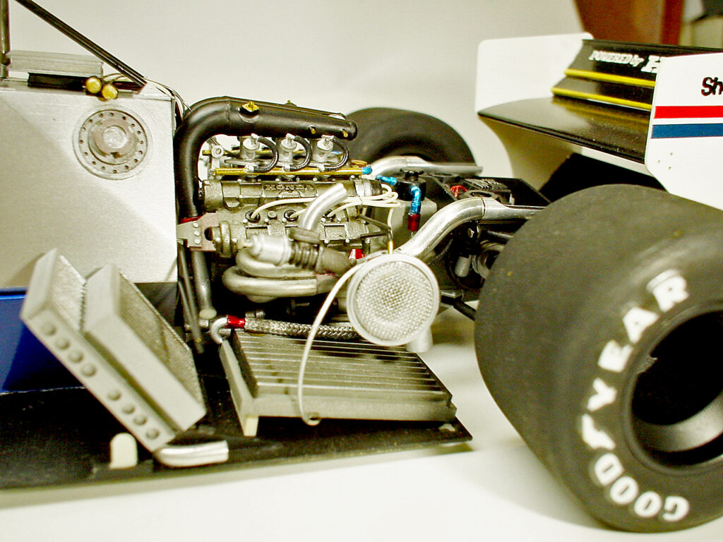 ターボへ空気を送り込むファンネルはラッパ形状を再現するため、型を作って真空成型してます。これに型押しした真鍮メッシュをはめてそれらしく。2段重ねのラジエターはF1キットからの流用、横置きのインタークーラーはプラバンからの自作です。ラジエターの下に見える白い爪がサイドパネルを固定する為の物です。冷却系のパイプやホースの取り回しで不明な部分が多く途中で切れたままになってるのはご愛嬌♪。