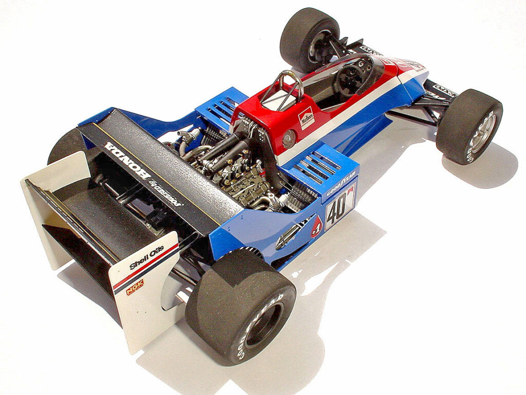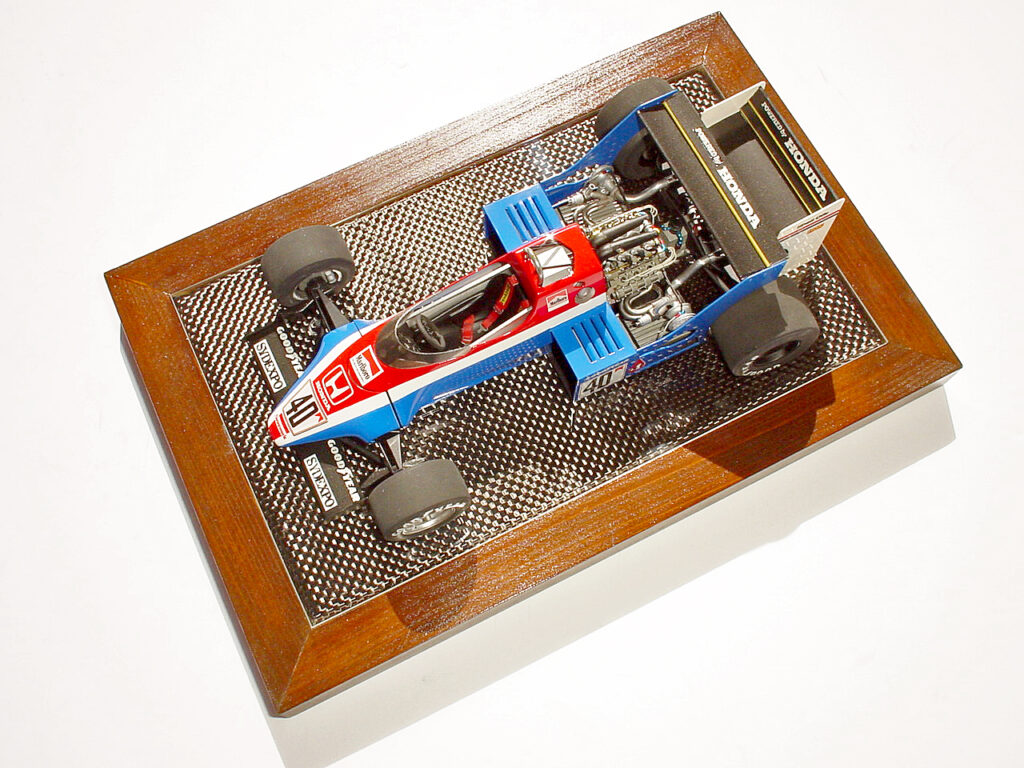 フロントのオーバーハング(鼻先)が少し短かったかも? 全体的には80年代前半のズングリしたデザイントレンド(笑)を上手く表現出来たと思うのですが。フロントのメッシュホイールは1/24ポルシェからの流用です(形状が違いますが、まぁ、雰囲気で)。リアは実車のホイール形状が良く分からなかったのでFW11の物をそのまま使ってます。