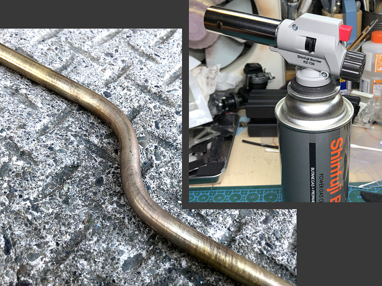 この為だけにパイプベンダーを買うか迷いましたが近所のホームセンターで安いガストーチを見つけたので、加熱して曲げてみました。