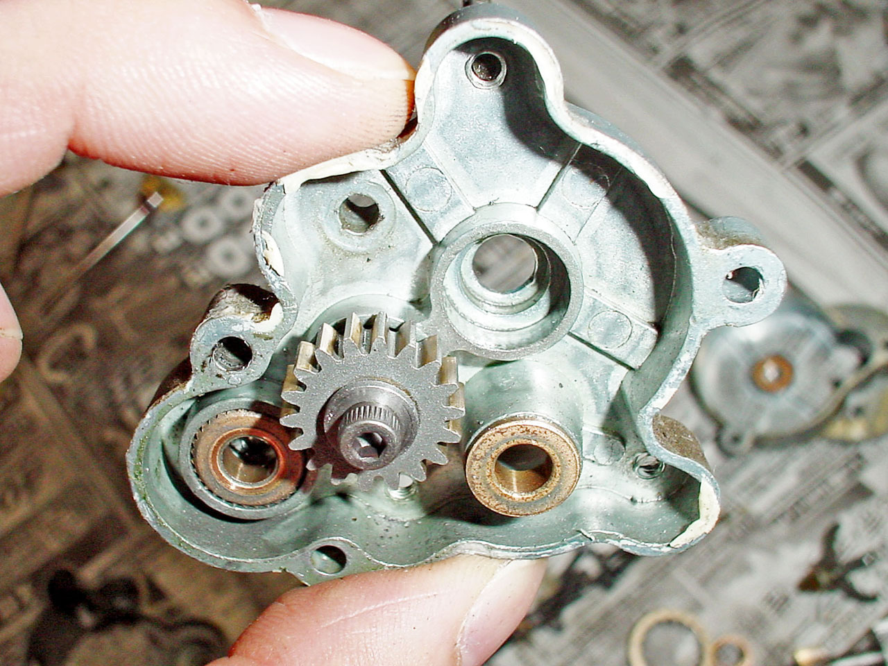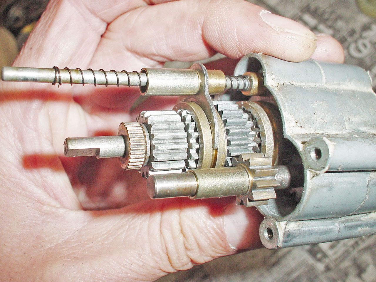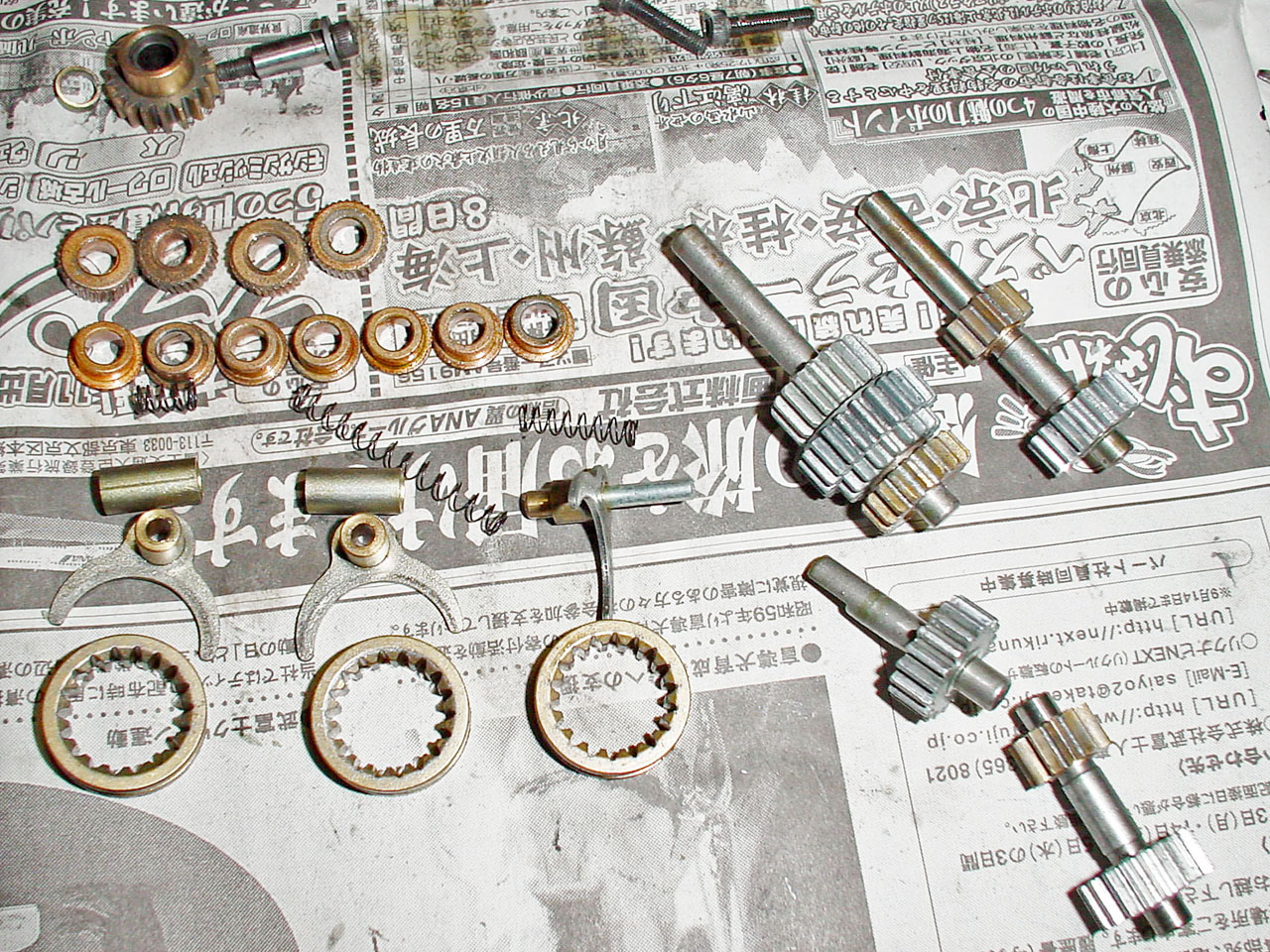 ハウジングは3段構成になってます。1段外す度に写真を撮っていきます。この時クラッチスリーブ等の可動部を動かして変速のしくみを理解しておくと組み立て時に役立ちます。前オーナーは、手入れもしないで壊れるまで遊ぶような乱暴な少年ではなかったようです。ギアは減りも少なく表面にはオイルも残ってます。組み説の「こまめにオイルスプレーを吹き付けましょう」という言いつけをきちんと守ったようです。