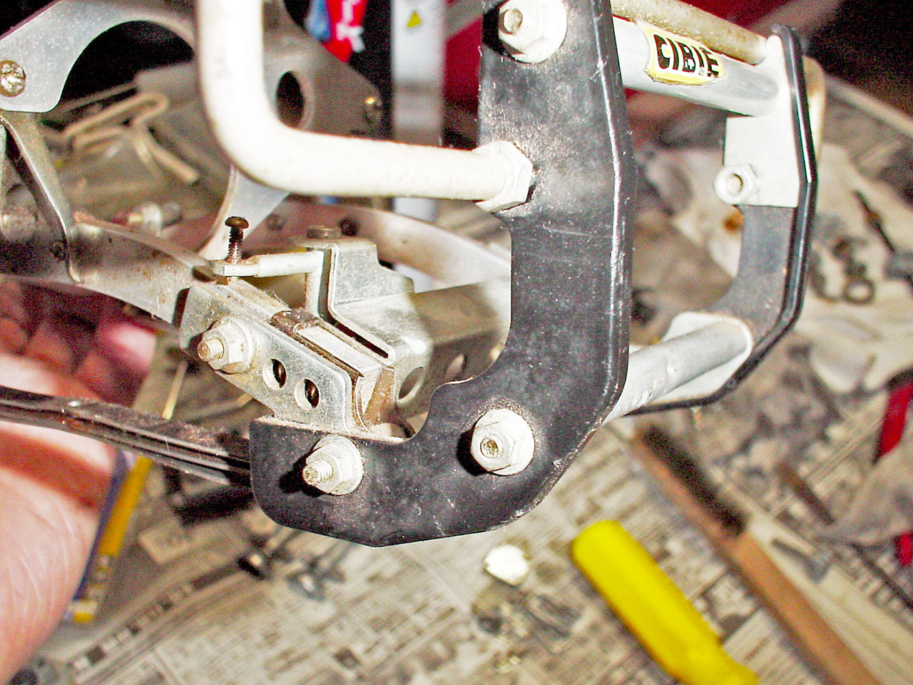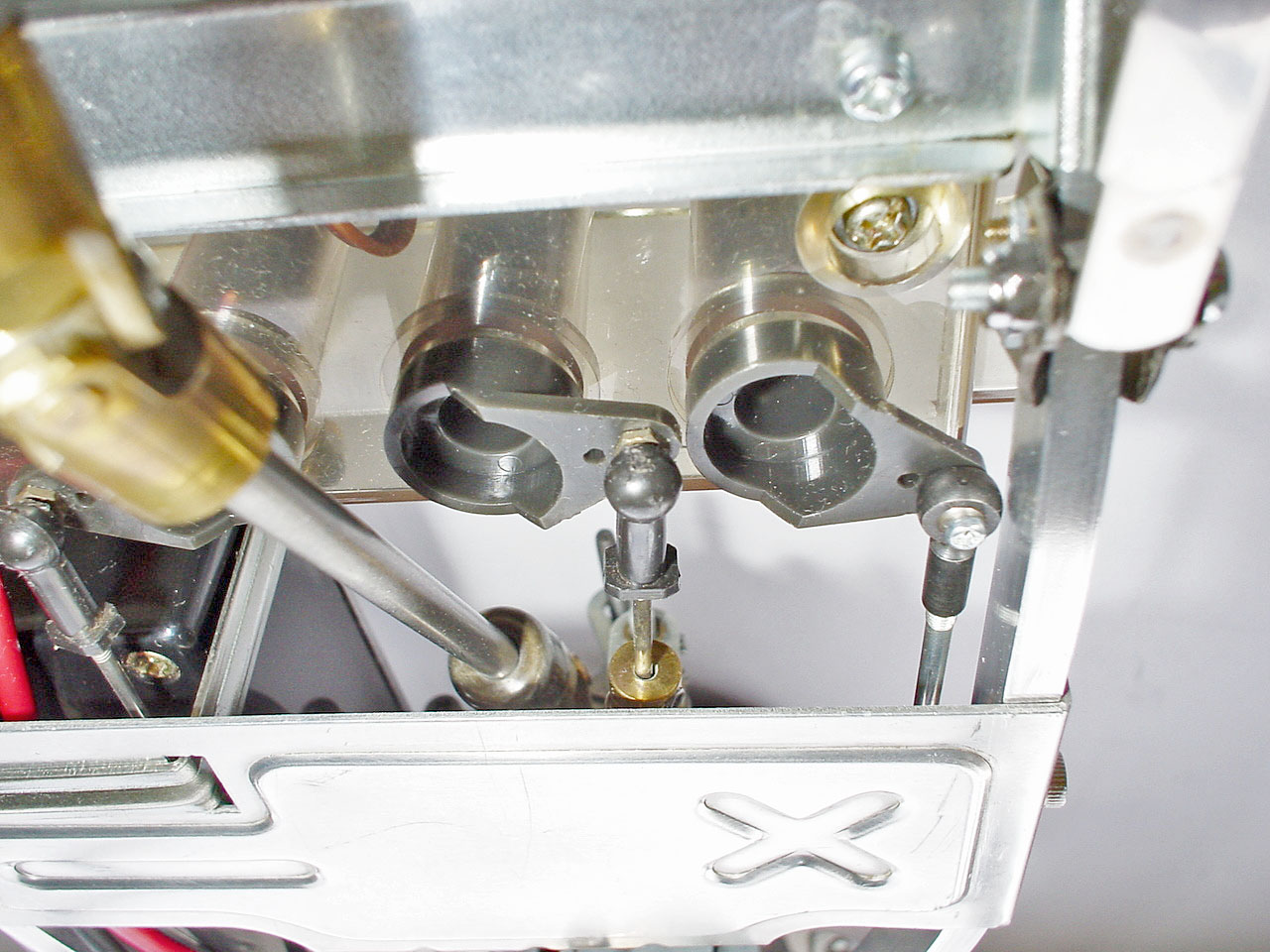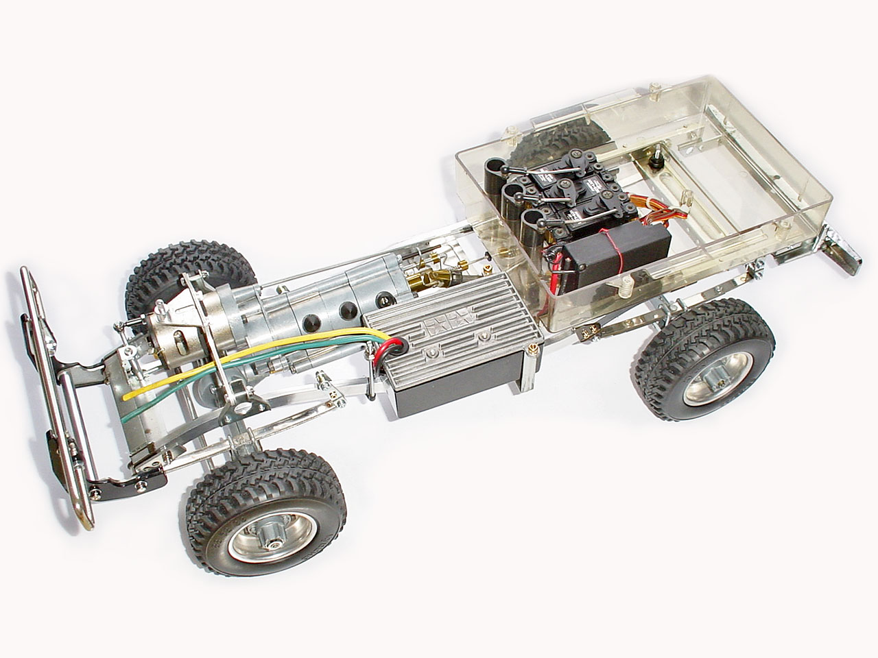 この時期のタミヤ車の例に倣い、RC装置の集中搭載&防水(滴)というコンセプトのため各リンケージが複雑で動きにも無理があります。メカBOXを上下に貫通した3本(ステア、スピコン、変速)のクランクを介して動きを伝えます。が、メカBOXとギアBOXがゴムブッシュでフローティングになっている事、リンケージの角度が良くない事、パーツ同士にガタがある事で全体にひどく曖昧な動作になります。
