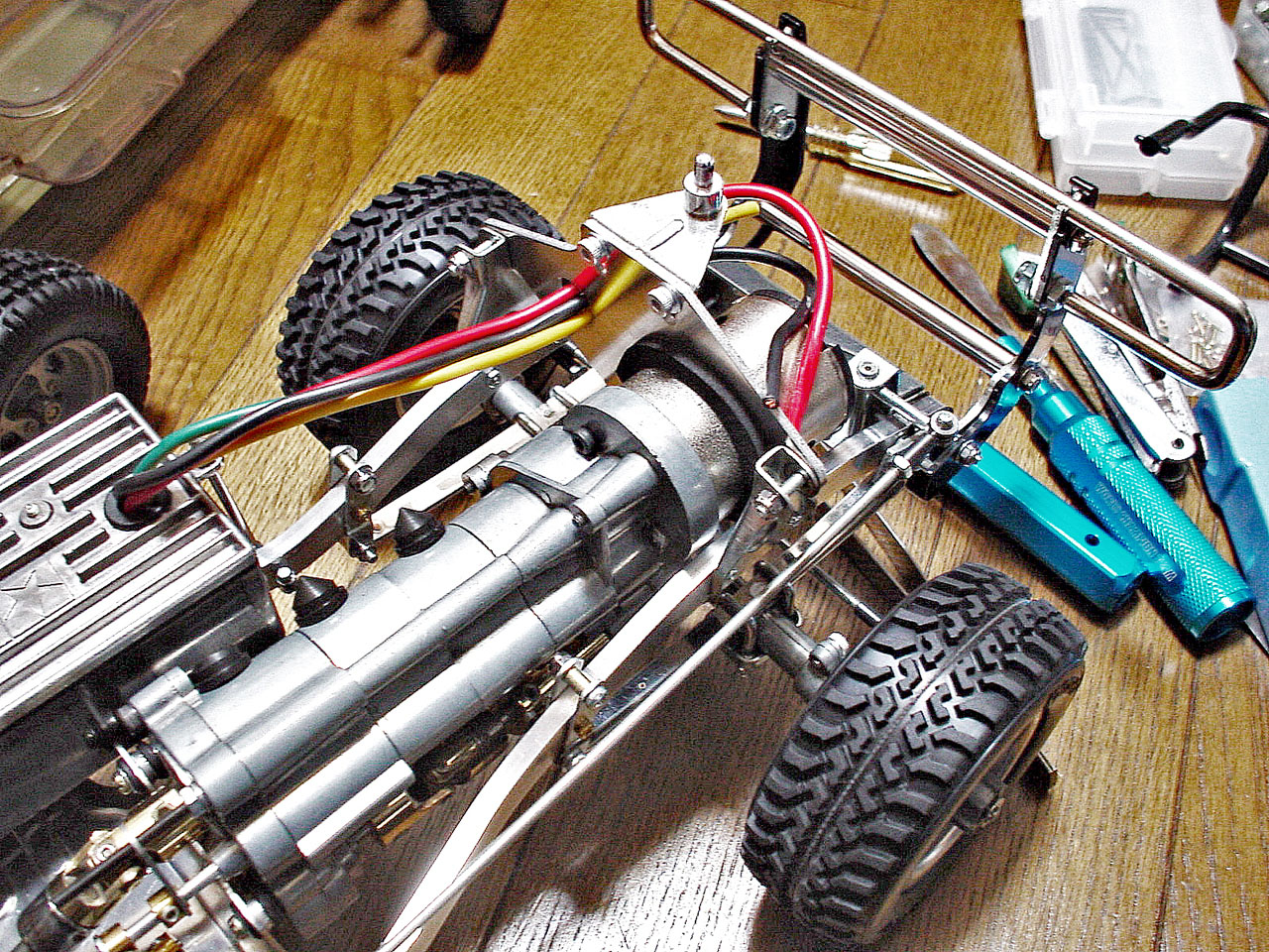 一見、堅牢に見えるアクスルホーシングですが補強リブ等もなく意外に柔らかいです。この車のも微妙に曲がってました。慎重に反りを戻してシャフトがスルスルに回転するようにします。もちろん軸受けはボールベアリングに交換します。最近海外ネットショップとかで見かけるこれ用のカスタムパーツに確かホーシングもあったような。あれってどーなんだろ。ちょっと気になります。