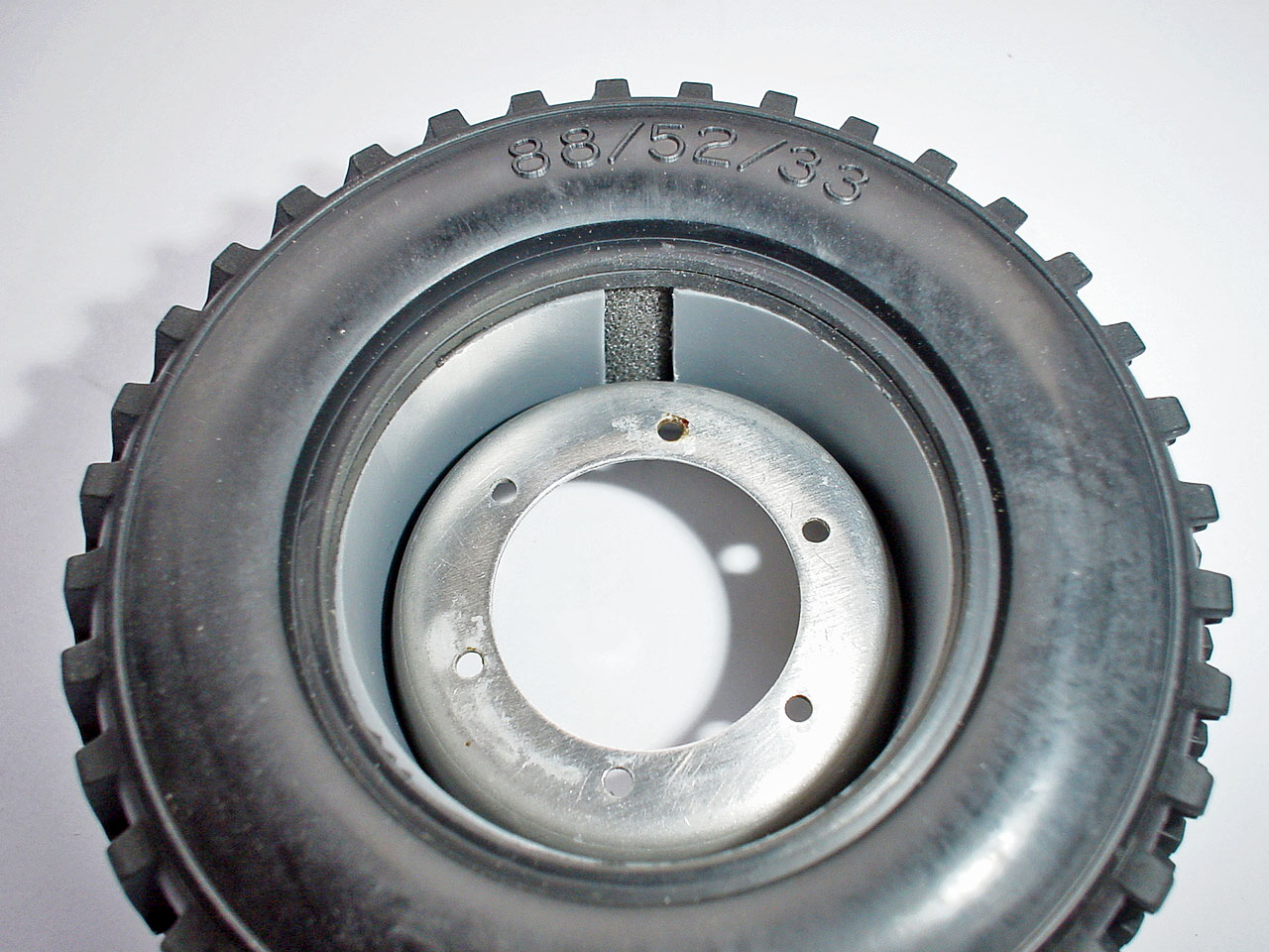タイヤは劣化が進んでいたので交換しました。アキバでいろいろまわって探しまくったところ内径がドンピシャではないのですが、京商のタイヤ(パジェロ?)が使えそうです。これに塩ビパイプを加工したインナーを入れてビードをロック出来るようにしてあります。ヘビーウェイトに耐えるようタイヤの中にはバギー用のハードインナースポンジを2重にして入れてあります。