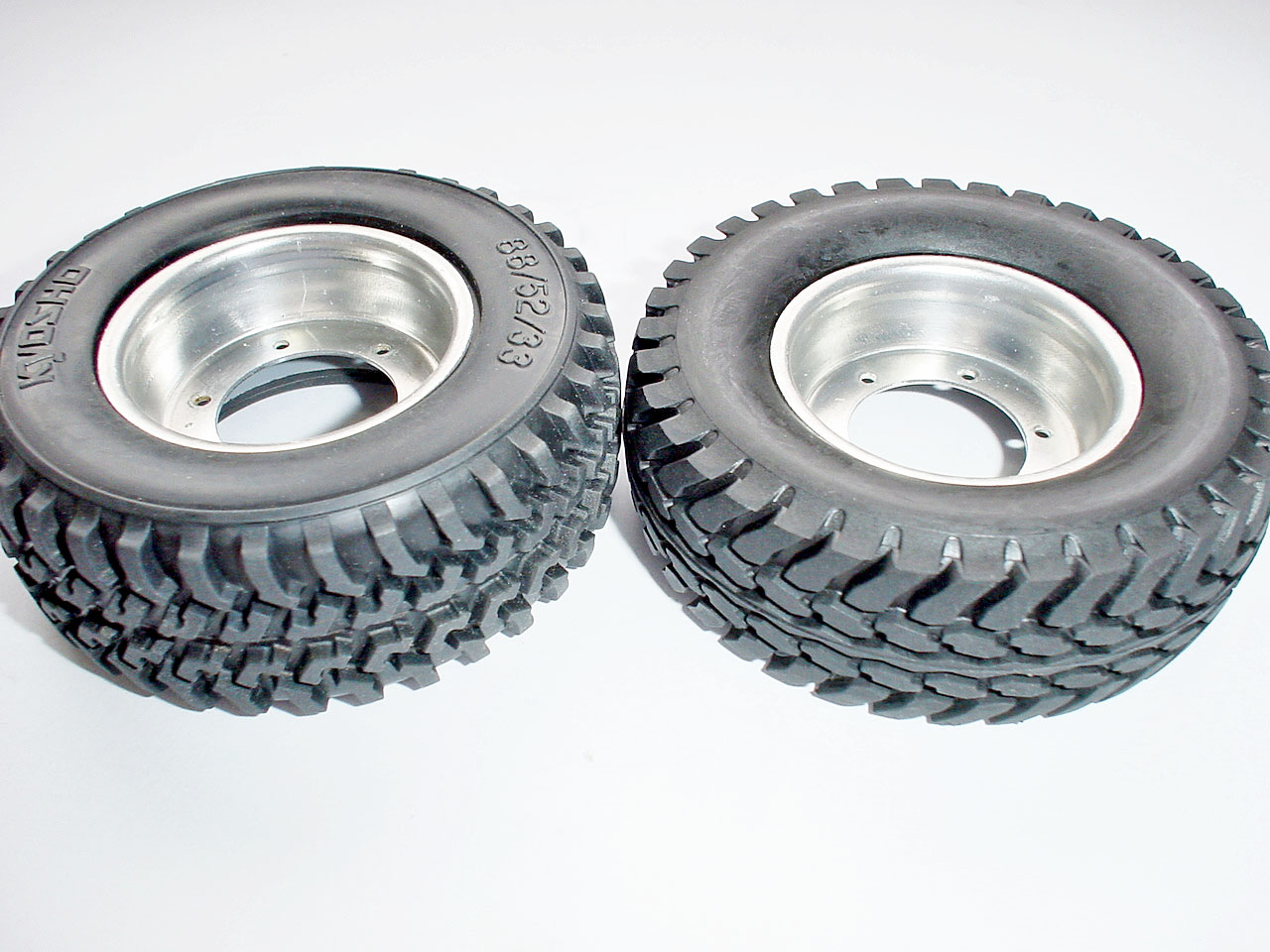 後にタミヤの軽装甲機動車用がピッタリという噂をGETして、早速購入しました。左が京商、右がタミヤの軽装甲機動車用です。内径は京商が52mmタミヤが51mmで、確かにハイラックスにはピッタリです。ただし幅がやや細く、少々「引っ張り」気味になります。塩ビパイプも切り直さなければならず、ちと面倒なので今も京商製のままです♪
