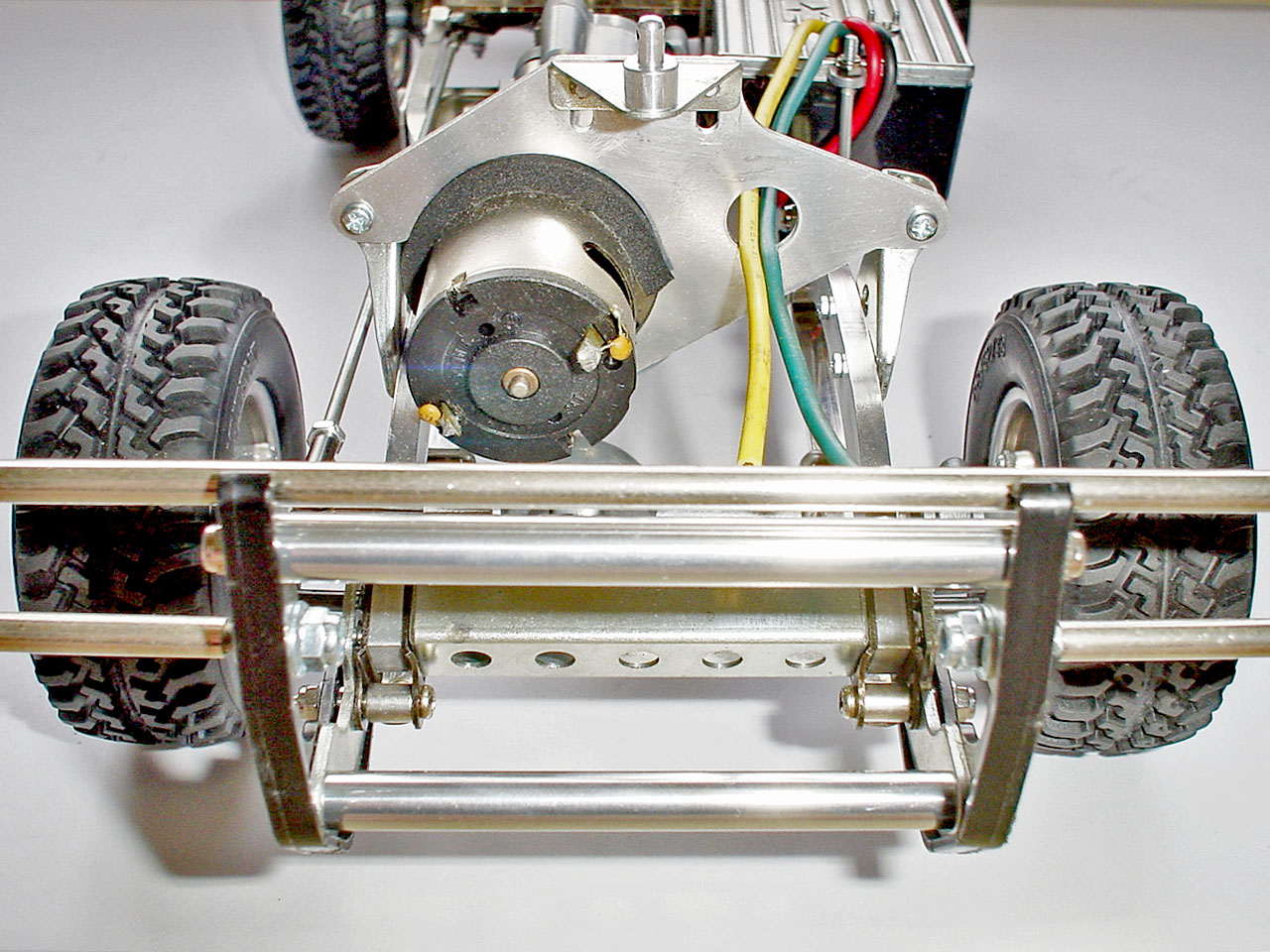 ホーシングを支える板バネは4箇所共にヘタッています。この車は3kg越えの超重量級ですがそれにしてもこの板バネは硬すぎます。岩場なんかではポンポン跳ねます。もっとフニャフニャに柔らかい方が実車感が出ると思うんですが。チャンプ流用のダンパーも、ちと頼りないし。ここは何か考えますか。