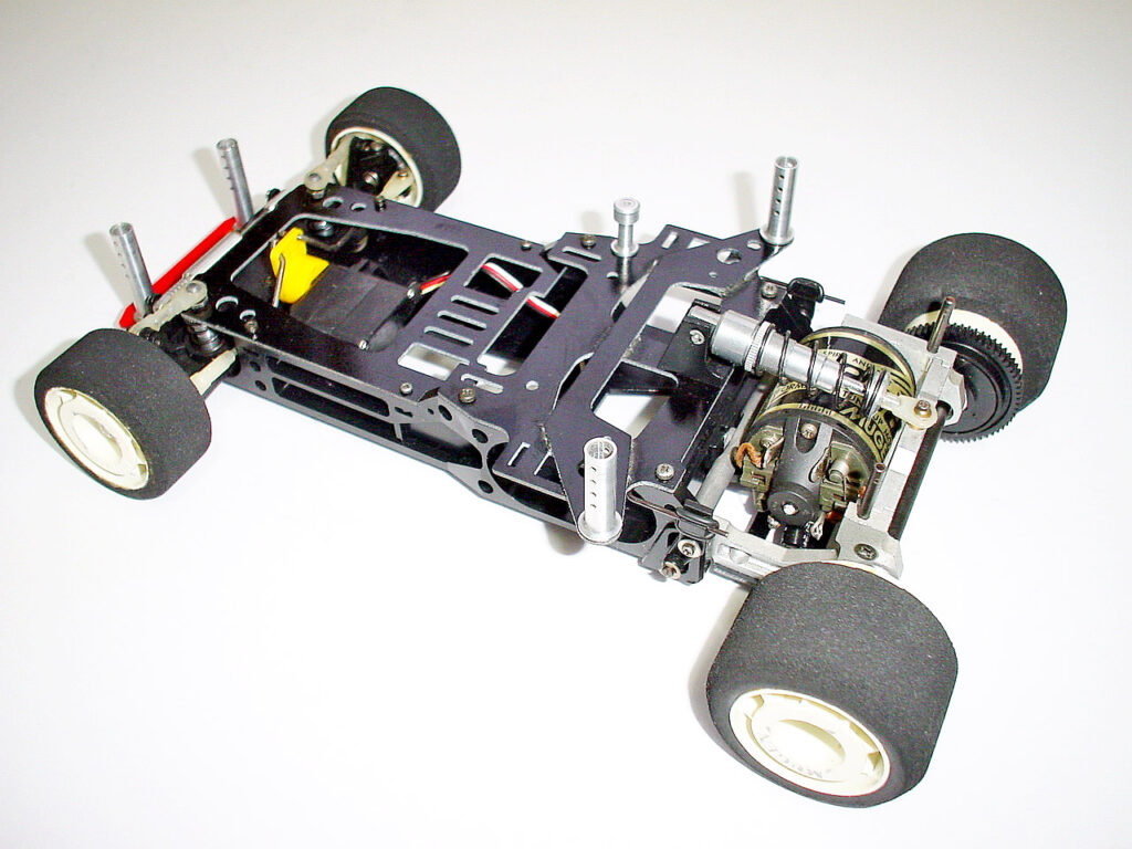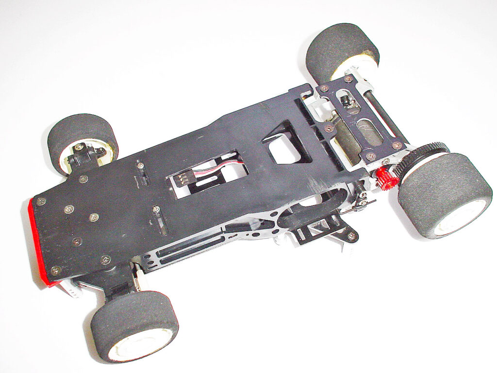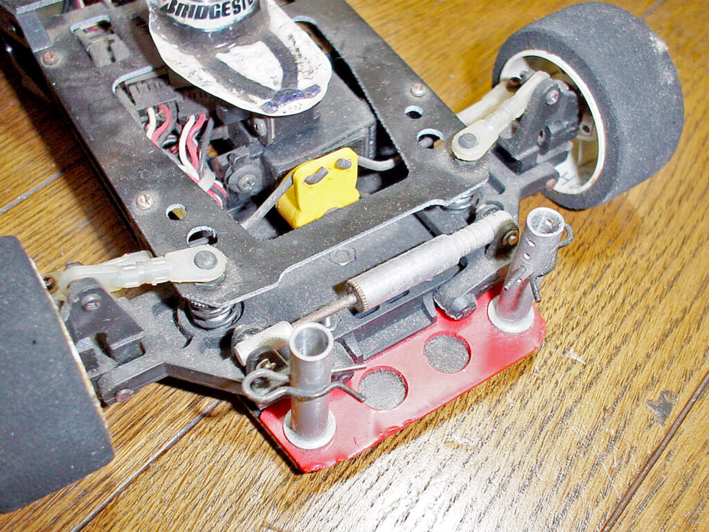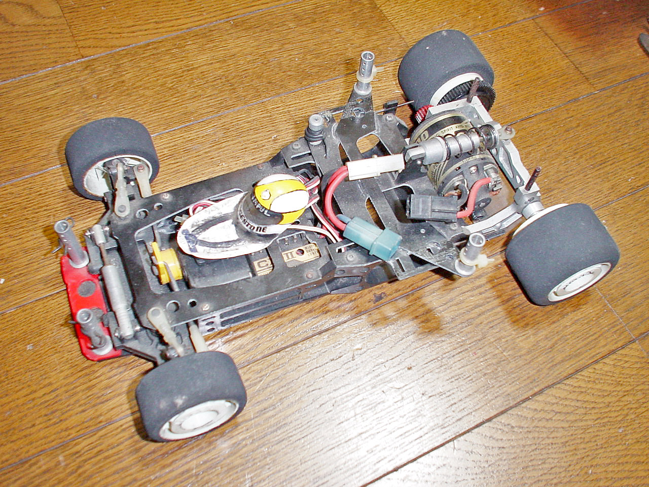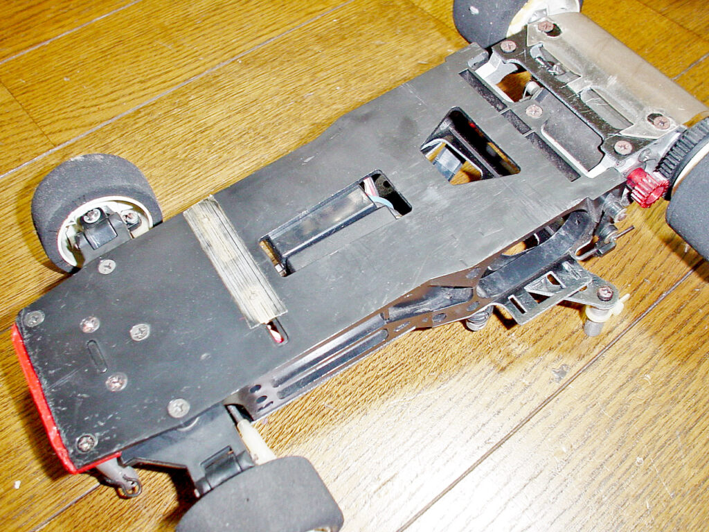 裏側。シャーシは一度交換しているそうで、傷みは少ないです。ただこのあとバラして発見したのですがモーターポッドの支点になる後端のビス穴に亀裂が入ってました。(残念!) リアサスは独創的なマルチリンク。後のプロテンや4セルレーサーにも通じる先見のアイディアです。