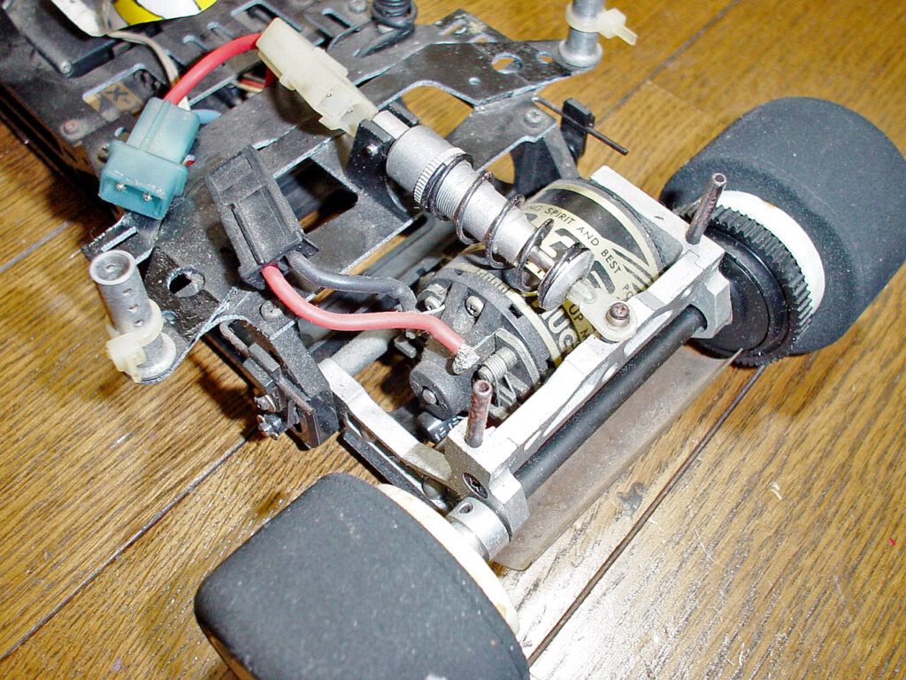 モーターは標準の「HS-358」。当時モーター名にはレース時間に合わせて「何分用」という数字を入れる例が多くありました。4分用は240、6分用は360、8分用なら480、1200mAのバッテリー容量をその時間で使いきる特性ですよって事でしょう。で、これは「358」。6分に2秒足りません!(笑)。これ、シャレだったらスゴイんですが本当の意味はどうなんでしょう?。
