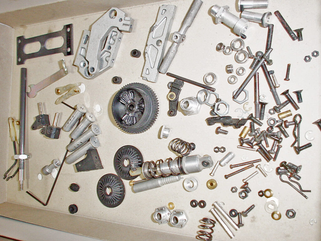 小物パーツ。ポッドを構成するプレート類は妙に軽いのでマグネシウム製でしょう。前後サスの構成やホイールハブ等のアルミパーツの形状はとても細かくて繊細です。インジェクションパーツも多く、メーカーの「やる気」を感じます。