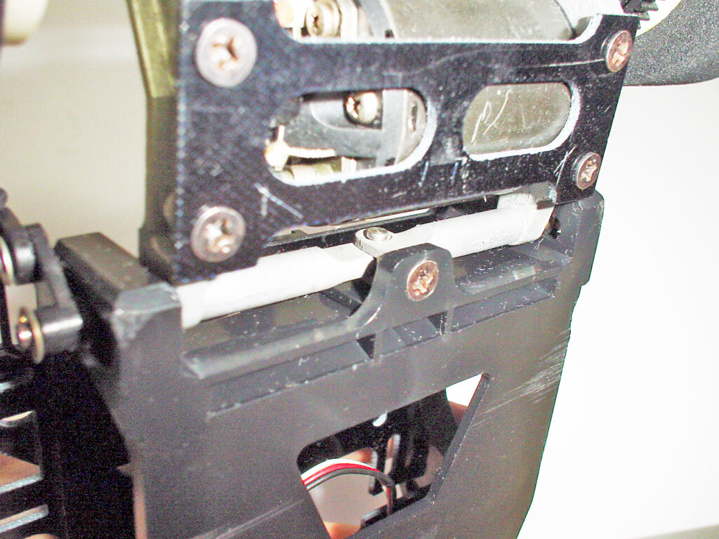 リアサス部分を下から。ポッド前部に固定されている丸棒の真ん中にあるピンがロール方向の軸になります。また丸棒自体がピッチングの軸になってます。この丸棒がシャーシ両端の壁を貫通して下の写真のリンクに繋がります。