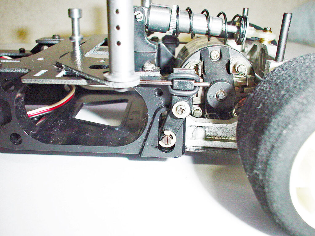 丸棒が通るシャーシ後端部分は縦に長穴になっていてポッドをロールさせます。スタビバーが丸棒先端に取り付けられたリンク上部にOリングで固定されます。動きがやや渋いので、実際どこまで機能してるか分かりませんが。