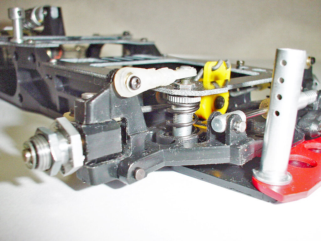 フロント周り。サスはスイングアームのダブルウィッシュボーンでセンターのモノショックで制御します。残念ながらショックシャフトは錆びオイルも抜け切っていました。シャーシは樹脂のモノコックで、FRPのアッパーデッキを載せるスタイル。このためシャーシ剛性はとても高いです。