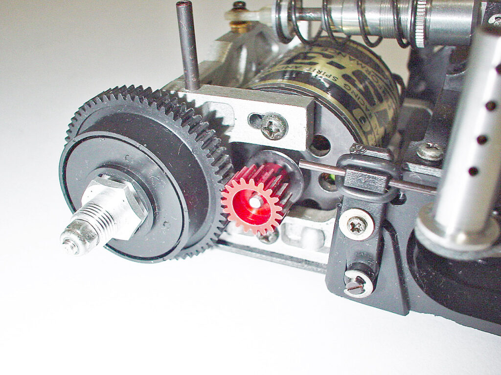 デフは3べベルのギアデフです。この当時ピニオンの歯数毎に色を付けるのがお約束だったような。緑のピニオンとかありましたよね? この赤は19tです。