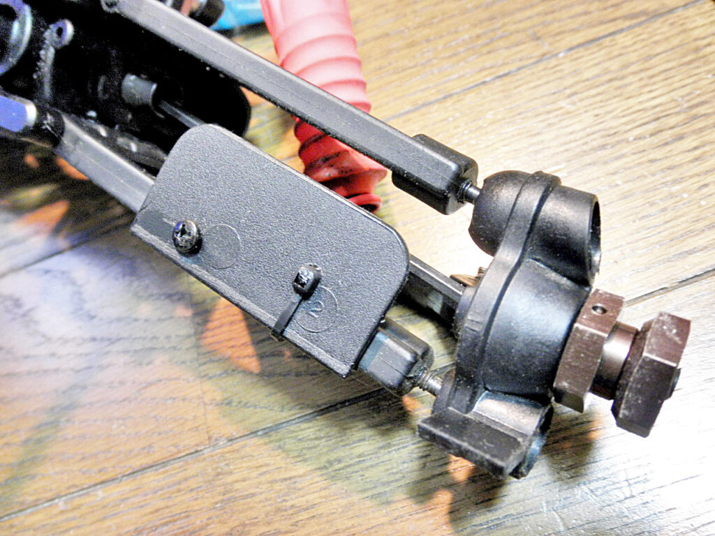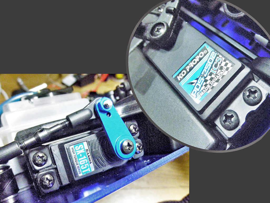 付属のKO製プロポセットは最新のFHSS方式!です。最新過ぎて(笑)手持ちのEX-1URとシンクロしないのでレシーバーを積み替えて対応します。さらに付属サーボのスペックは0.19sec ,4.1kg。これでは少々頼りないので、ステアリングをSANWAの9.5kg、エンコン/ブレーキはKOの8.3kgに交換します。やっぱり、結局R/C装置は全部交換になりました。ステアリング側はホーンをアルミに替えておきます。