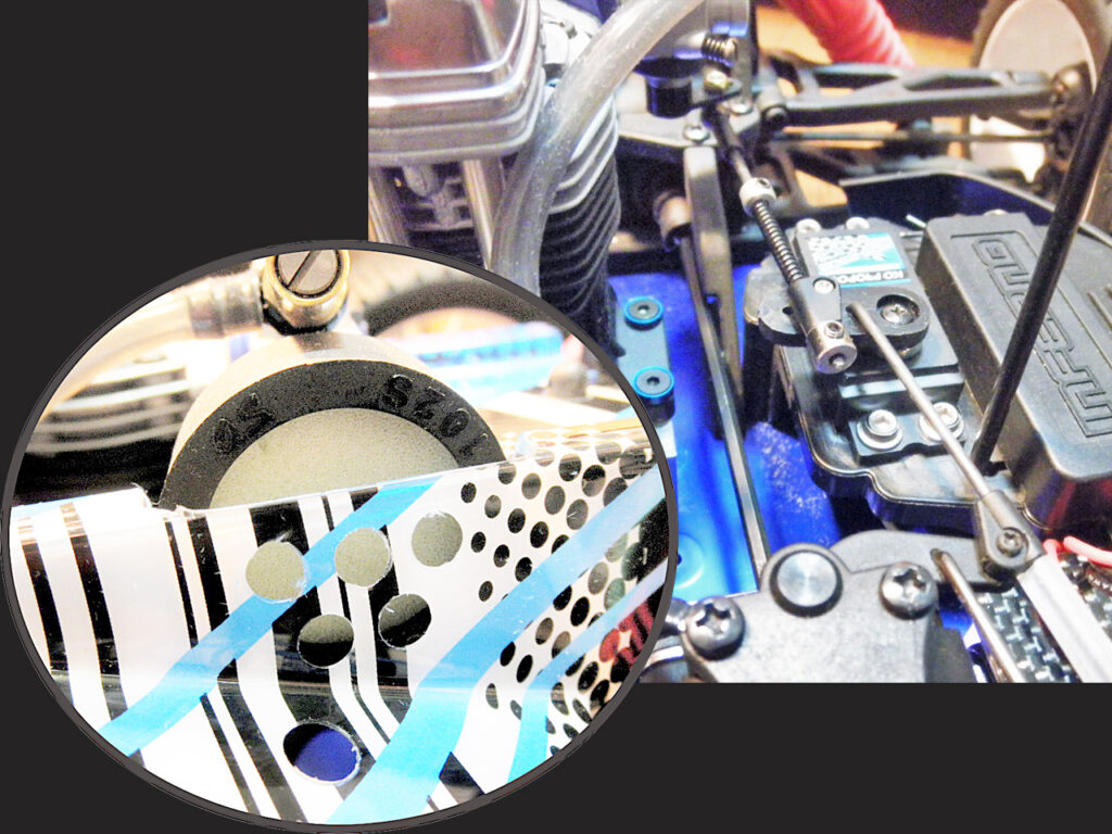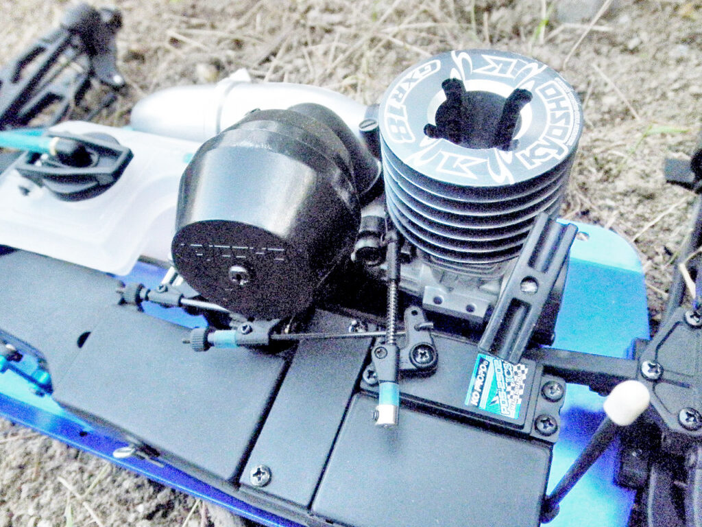 マシン自体はエンジン積み替えたりアルミパーツ付けたりする前に一旦ノーマル状態で走り込んでみます。いろいろとイジる前にこの車の基本的な特性や弱点を知っておきたいので。で、さっそく付属の18エンジンを慣らします。コレ、ヘッドは流行りのロゴプリントでオシャレです♪出荷時のニードルは2回転半戻し。台上で回しながら2回転まで絞って、走らせます。車体が軽いので、想像以上に動きは軽快です♪さらに絞って1回転半ちょいになったところで今日はおわり。