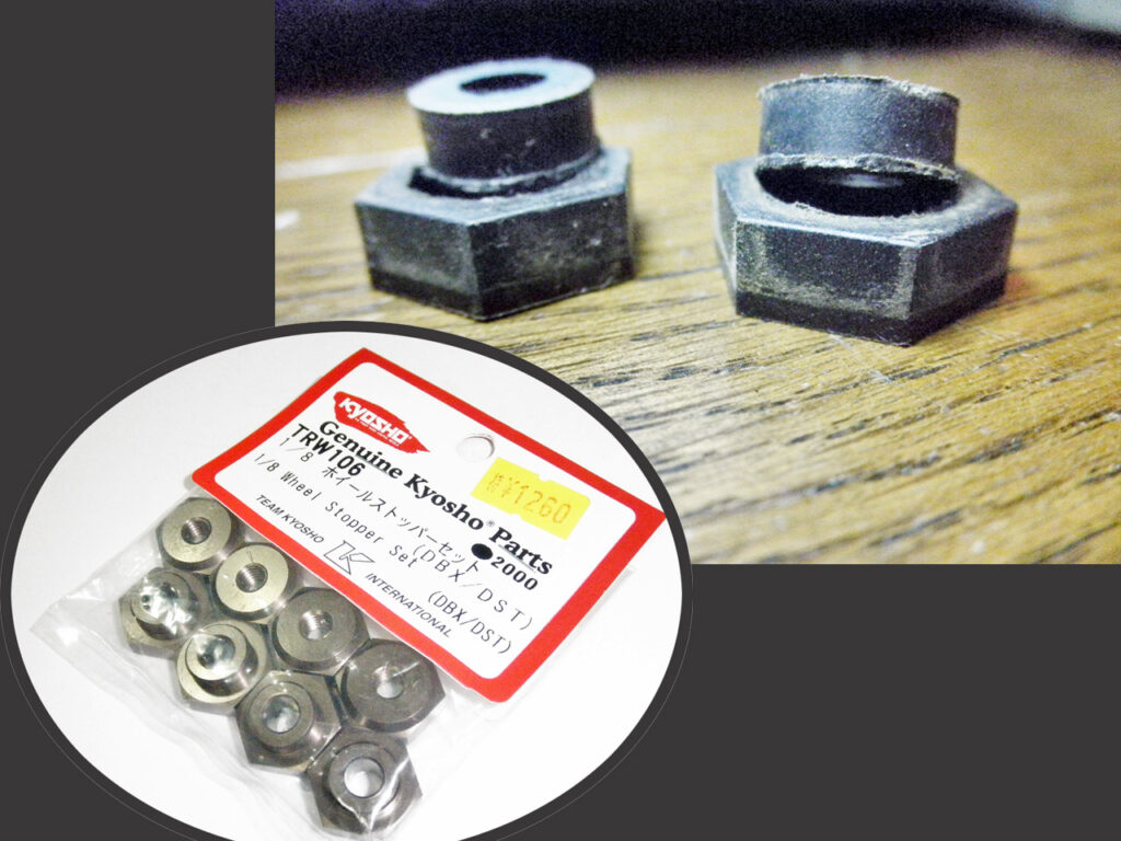 4タンク目あたりから車の挙動が不安定だったのでチェックしてみるとホイールが緩んでグラグラに。何度か増し締めしながら走らせたものの、帰宅後にメンテのために外してみたらハブ3個がチギれてました。設計ミスで円柱部がホイール表面より飛び出すので、ナットがホイールに当たる前にハブ自体を押し潰すのが原因です。この樹脂製変換ハブは悪評通りのクオリティーでした。翌日、別件でたまたま水道橋に出掛けたついでにアキバの洛西モデルでオプションのアルミ製をGET。