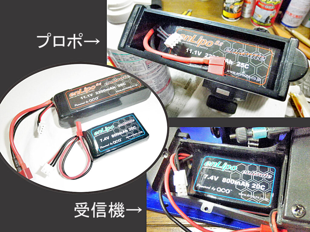 さらに受信機電源のNi-MHが死にかけてたので送信機用共々エンルート製のリポバッテリーを購入しました。こちらはフタバ産業の1Fで。送信機には太いワイヤーの動力用3セルを入れて急速充電できるようにしました。電源供給用の細いワイヤーは別に接続してます。容量は2,200mAh。バッテリーサイズが若干大きかったので送信機内側の補強リブを一部削って対応しました。受信機用は800mAhの2セルでサイズはピッタリ♪ただしサーボがハイボルテージ仕様ではないのでタミヤのBECレギュレーターを接続(大丈夫?)しました。