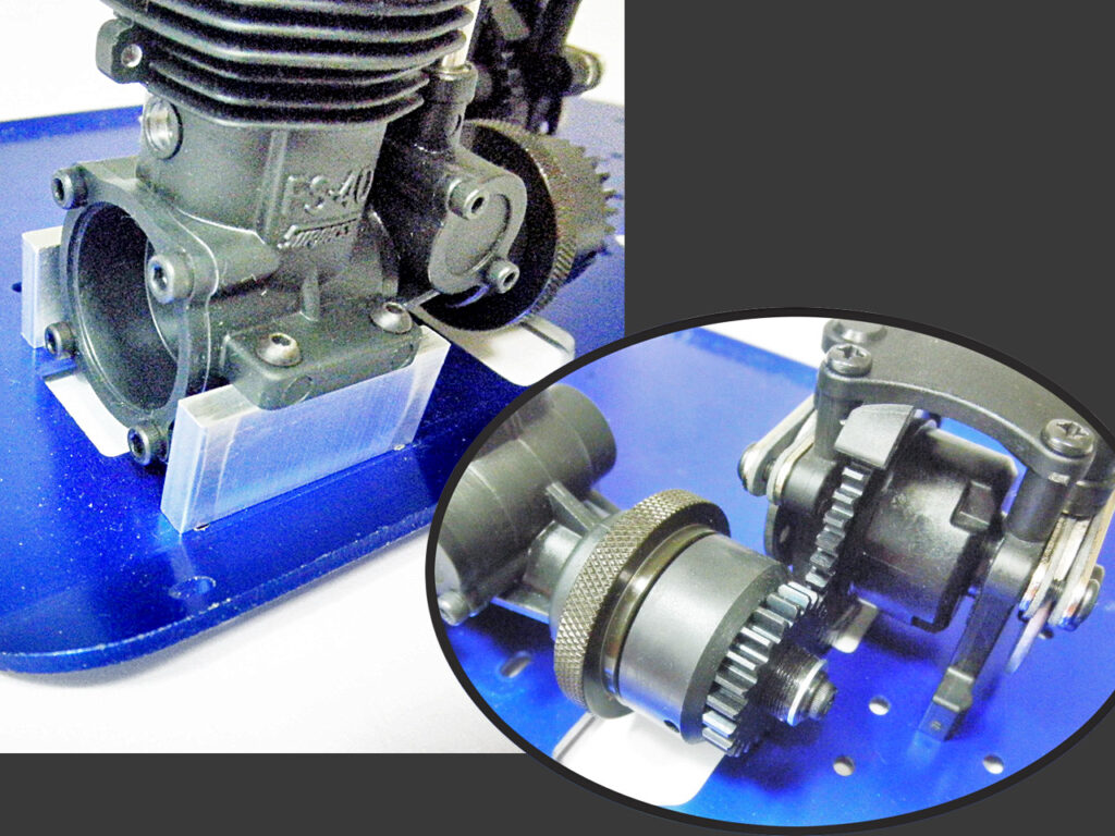 メンテの為にバラしたついでに本題の4stエンジン搭載の準備を始めます。まずエンジンに合わせて、アルミ材からマウントパーツを切り出します。これに穴開けとネジ切りをしてエンジンに仮止めします。シャーシとの位置決めは、メインギアをスチールスパーに交換した状態で合わせます。ピニオンギアは23Tをチョイスしましたが、何枚が適正か見当も付かないのでまずはこれで試してみます。