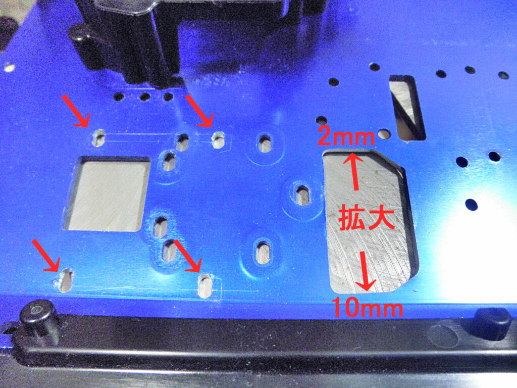 オリジナルのエンジンマウント穴は使えないので、全て開け直します。ピニオンはこれ以上大きくならない?と思うので、各マウント穴はスパー側に向けて長穴にしておきます。シャーシ裏側に段差加工出来なくてビスの頭が飛び出しますが、チタンのバインドビスで削れ対策しときます。またエンジン搭載位置が大きくズレた分、スターター用の穴を外側10mm、内側2mmほど拡げました。これでとりあえず、4stエンジン搭載の準備は完了♪
