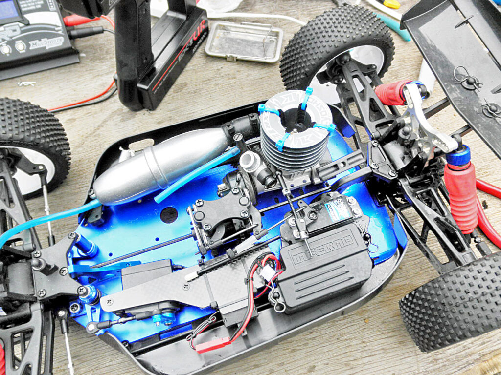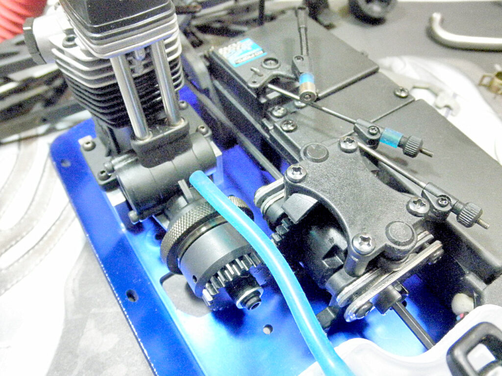 格闘すること2時間。疲れた・・・。せっかくの貸し切り状態なのに1周も出来ないなんて事になるのか?なので、4stはここであっさり諦めて(笑)2stに積み替えます。エンジンを載せ替えリンケージを元に戻します。エンコンサーボのストロークを調整して約15分で準備完了、はやっ。