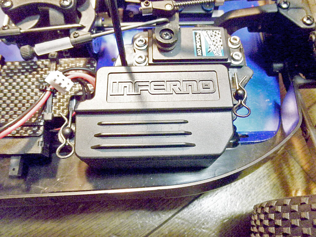 カスタムついでにサイドガードも装着します。これはインファーノ用の後端を加工して取り付けました。出来の悪いメカボックスがこのサイドガード装着時に干渉するので外してしまいます。替わりに、同じくインファーノ用の受信機ボックスを付けてみました。余談ですが京商のメカボックスは本体とフタの噛み合わせ、フチの段差が上下逆なので、妙に砂が入り込みます。(因みに無限の形状が正解♪)パッと見インファーノみたいになってちょっと嬉しいです。