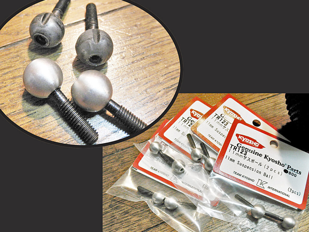 この車、販価下げる為にサスボールがプラスチック!(写真上の黒い方)です。別に樹脂でもいいんですが、精度悪すぎて動きが渋いのは頂けません。フロントはステアニュートラル状態でガタ調整をしても舵を当てるとキツくてサスが動かなくなります。オプションで精度の良い金属製パーツが用意されますが2個入りで800円!もします。う~ん、どーしよう?・・・。まあ、悩んだってどーせ最後は交換するんだろうと思い1台分8個をまとめて購入、交換。