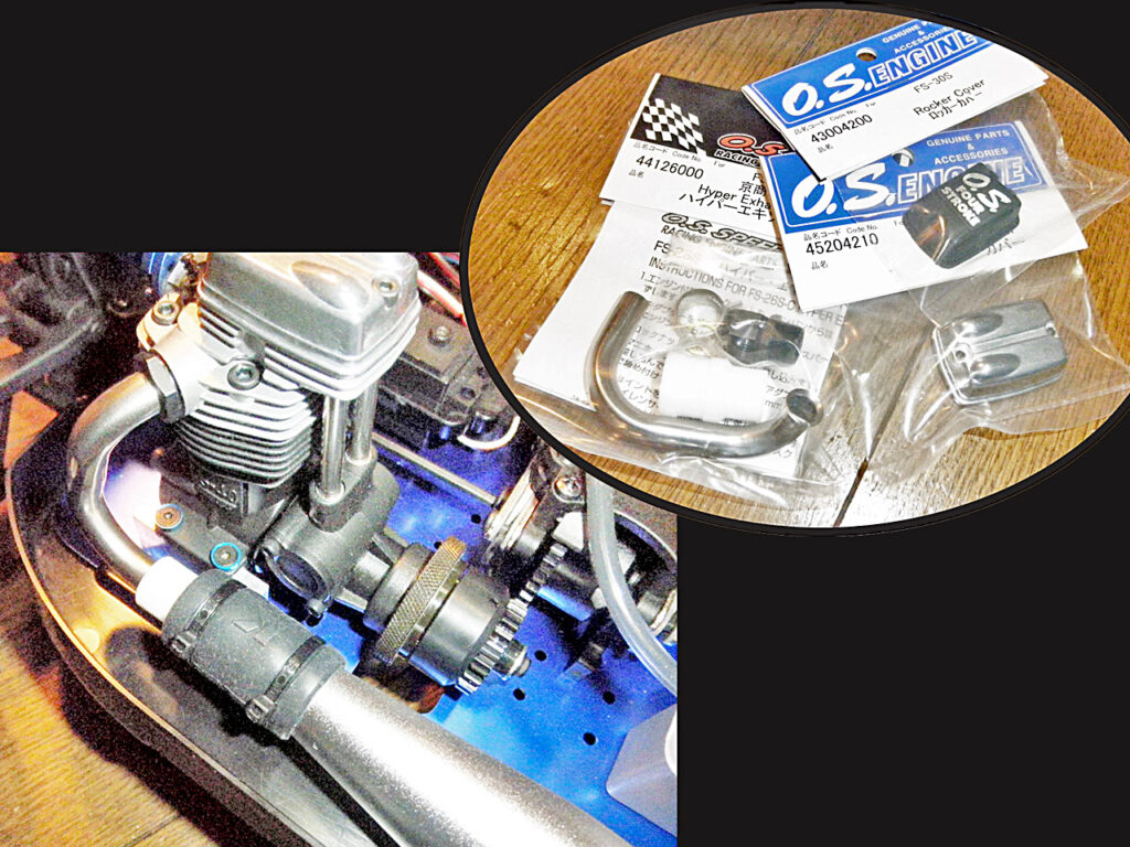 後はリンケージと排気系を装着すれば走行できますが、エキパイが入手出来ません。FS40S-C用のO,S,純正パーツは有るんですが、残念ながらコイツはサイレンサー左出し用です。エンジン縦積み・排気右出し用のエキパイをGETできるまで4stエンジンのサーキットデビューはおあずけです。転倒してキズだらけになりそうなロッカーカバーも一緒に、O,S,エンジンにパーツ注文しました。