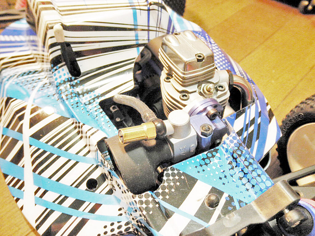 リンケージはこんな感じでシンプルに。キャブのスロットルレバーとサーボホーンの高低差が少々気になるので、キャブ側をボールリンクにしてロッドを水平にします。エアクリーナーはとりあえず標準の「102S」を使います。キャブアダプターで吸気を90度振り、泥除けの為にボディーに潜り込ませます。が、このままではオフロード走行には少々不安なのでなにか替わりを探しましょう。